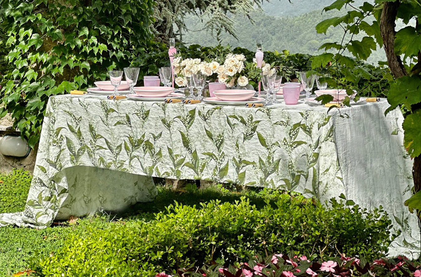 Imagined in a soothing palette of delicate greens with white, our linen homage to Lily of the Valley is a versatile design that conjures thoughts of purity, sincerity, and happiness.