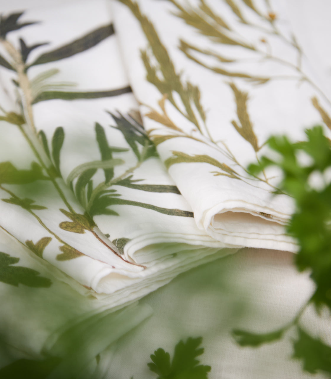 Unfurl this linen upon the table and discover a rare botanical folio: a study of florals gathered into painterly tilework.