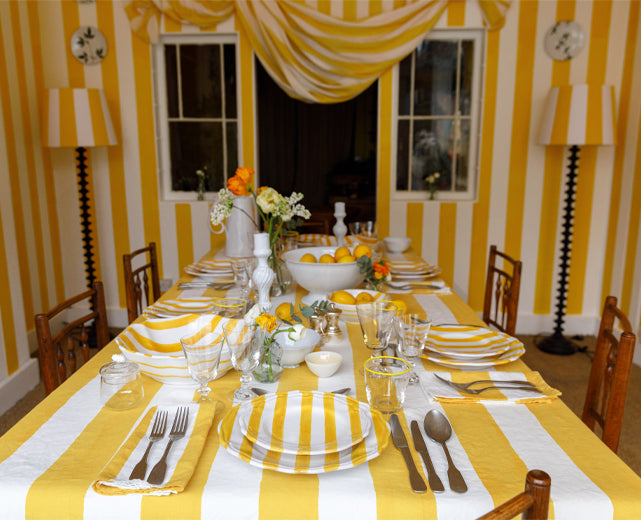 'Stripe’ - our colourful rendition of happy moments made on Mediterranean escapes in bygone days. These striking stripes in dual tones and printed on 100% linen will transport you and your guests back to those hazy days at the height of Summer.