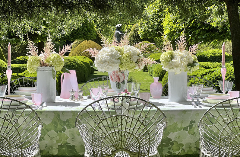 "Hydrangea" - a collection of floral inspired tablecloth and napkins. The collection is an ode to a forget-me-not summer, inspired by the blossoming and bountiful hydrangeas planted within the communal gardens of Notting Hill. Crisp white forms an elegant backdrop to exuberant inflorescence's in warm, sultry shades of green, printed onto a 100% pure linen. This tablecloth is the ultimate floral statement, for the happiest of tables, perfect for providing that distinctive feel of summer joy.