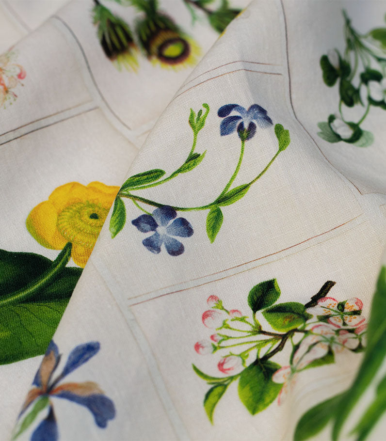 Unfurl this linen upon the table and discover a rare botanical folio: a study of florals gathered into painterly tilework.
