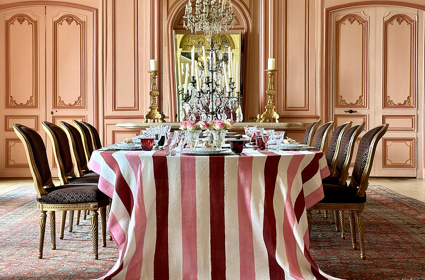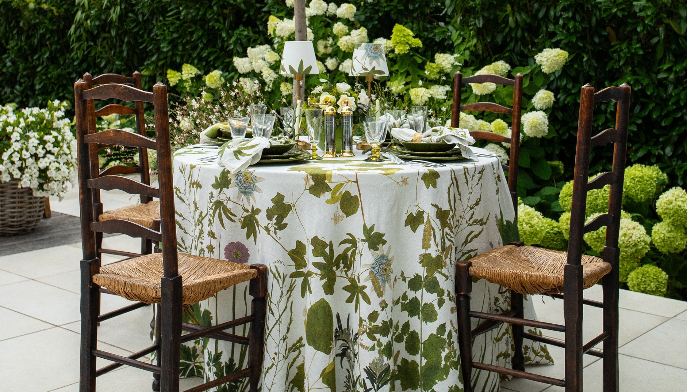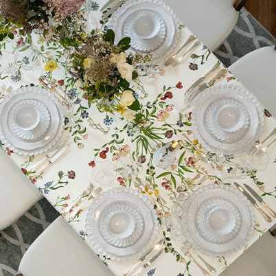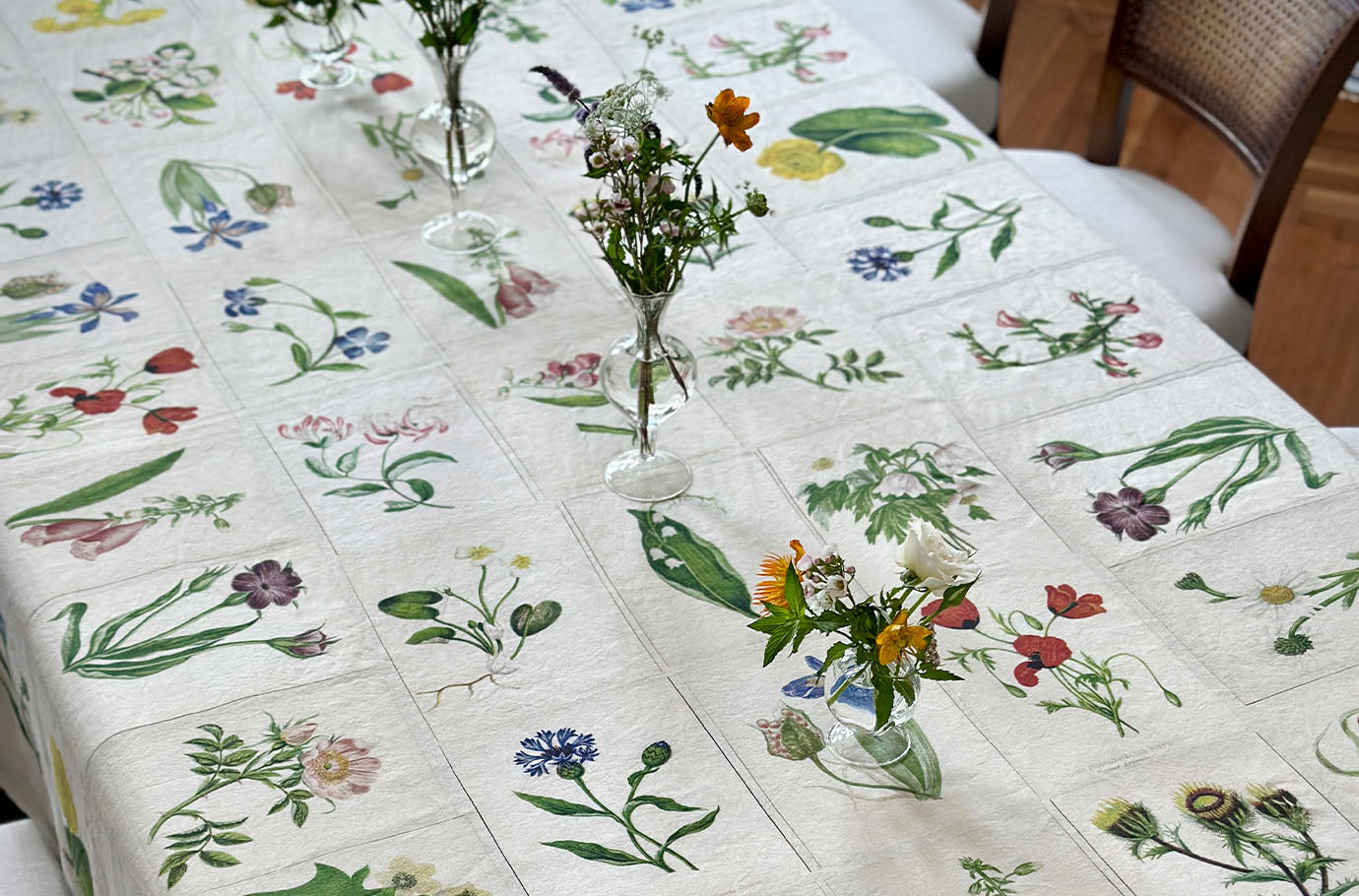 Petals, stems & blossoms from John Derian’s botanical decoupage reimagined in 'Botanical Wildflower' design, blooming in colour and quiet charm across our 100% french linen tablecloth and napkins.