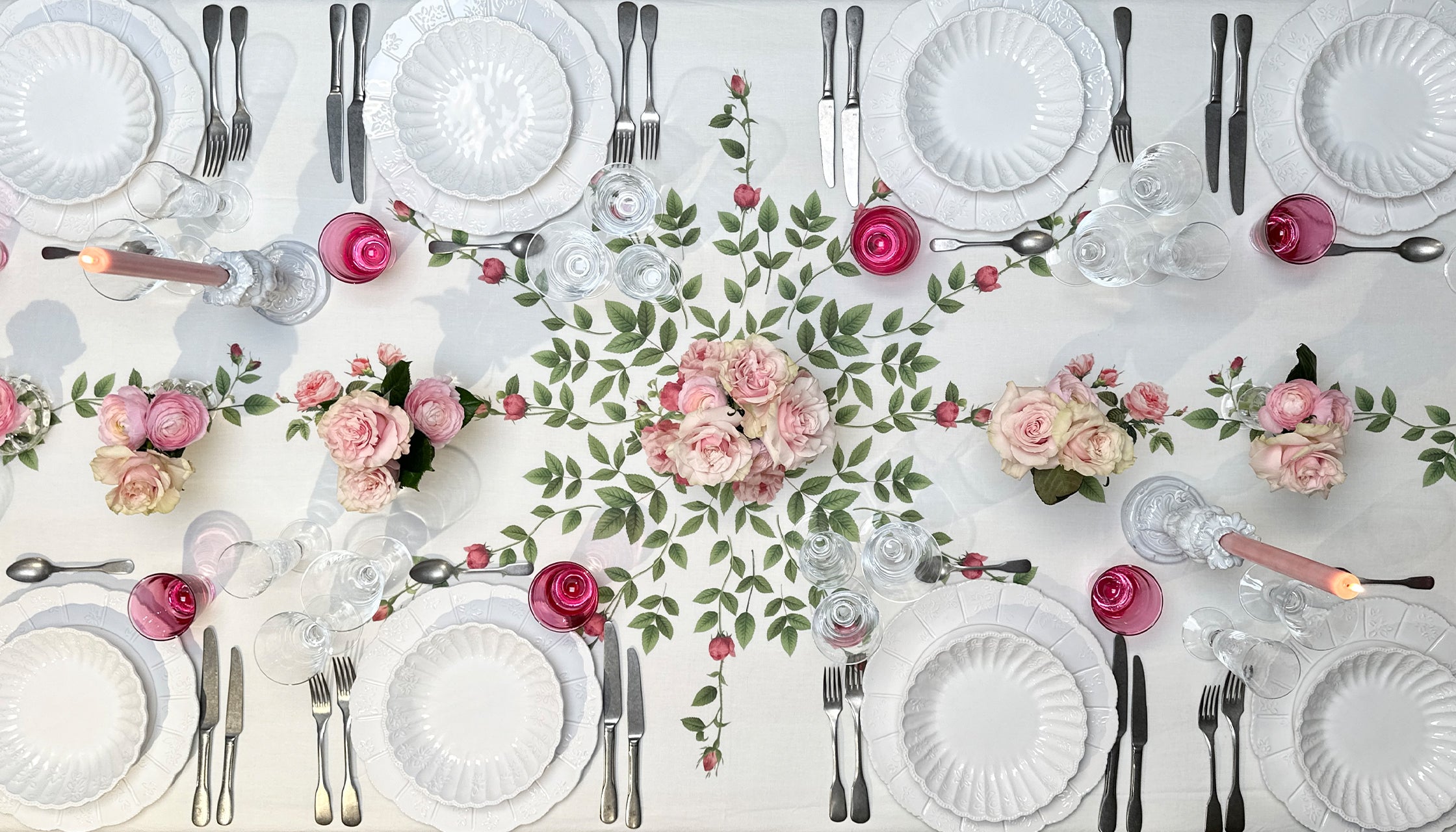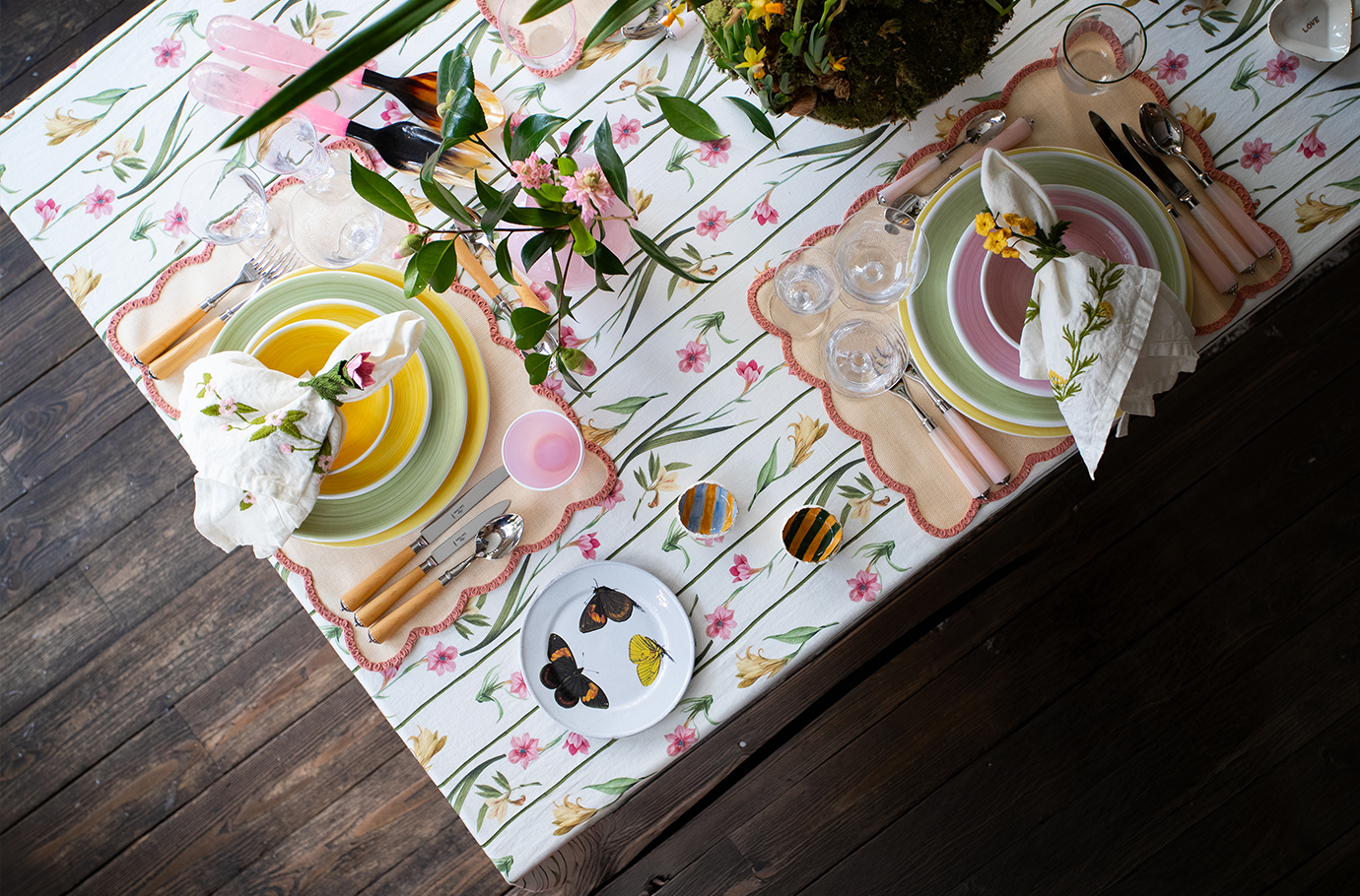Petals, stems & blossoms from John Derian’s botanical decoupage reimagined in 'Botanical Wildflower' design, blooming in colour and quiet charm across our 100% french linen tablecloth and napkins.