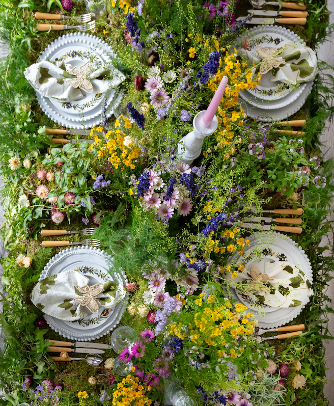 Dining Upon a Bed of Flowers was our love letter to the art of gathering, a table laid atop a wild meadow of blooms, where our signature linens met the poetry of nature in full bloom.