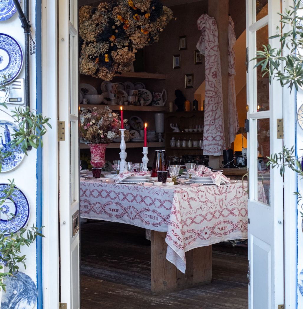 Our 'Amour Bonheur' table linens are laid out in the shop to spread love & happiness, just as the name suggests, bringing a touch of romance to every meal.