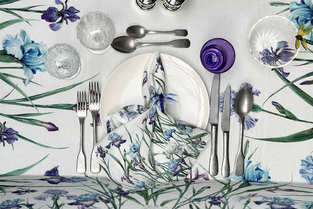 Introducing 'Iris', our interpretation of nature's most flamboyant perennial, that once in bloom, signals the start of the summer season. The design started out as original hand painted artwork and now graces 100% pure French linen. With its intriguing blends of colour in fresh blues and lilacs, and sculptural shape - Iris captures the spirit of summer dining.