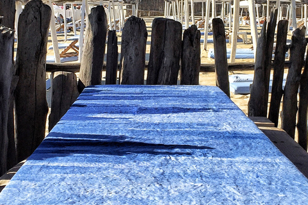 The motivation for the design of this tablecloth stems from quiet moments at the Beach Bar early in the morning, before the buzz of joie de vivre fills the air. Sitting amongst the driftwood, golden light, and a vast array of sea-inspired blues, it is difficult to feel anything but welcome.