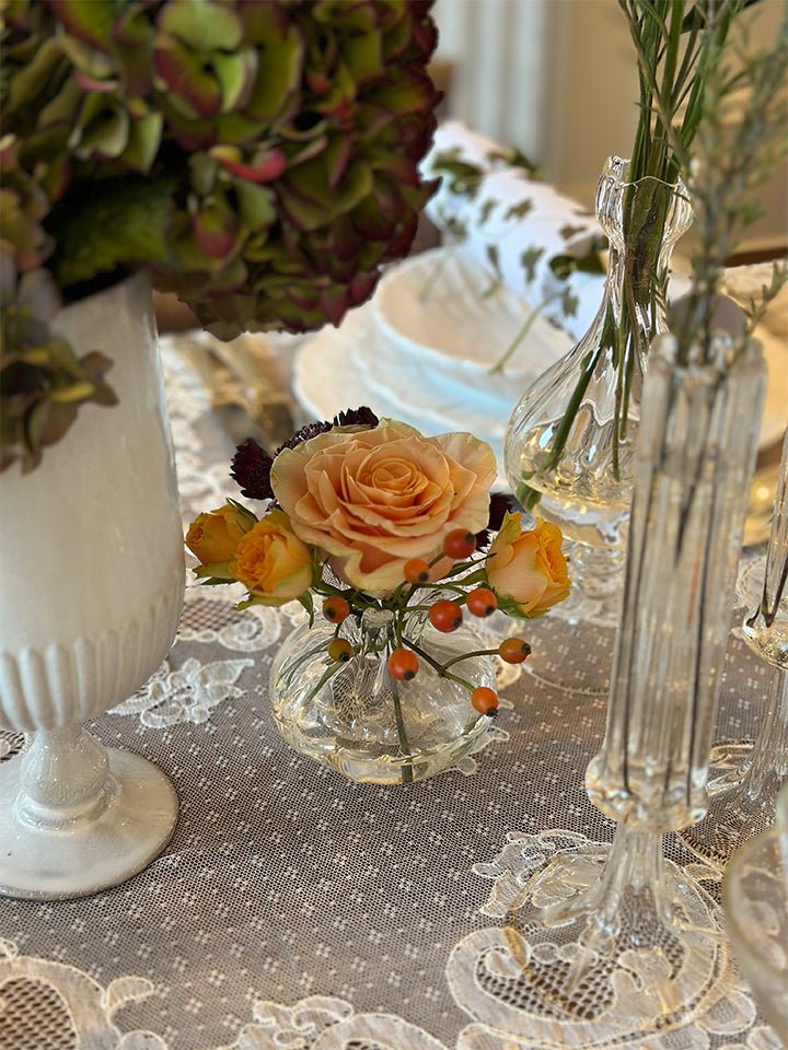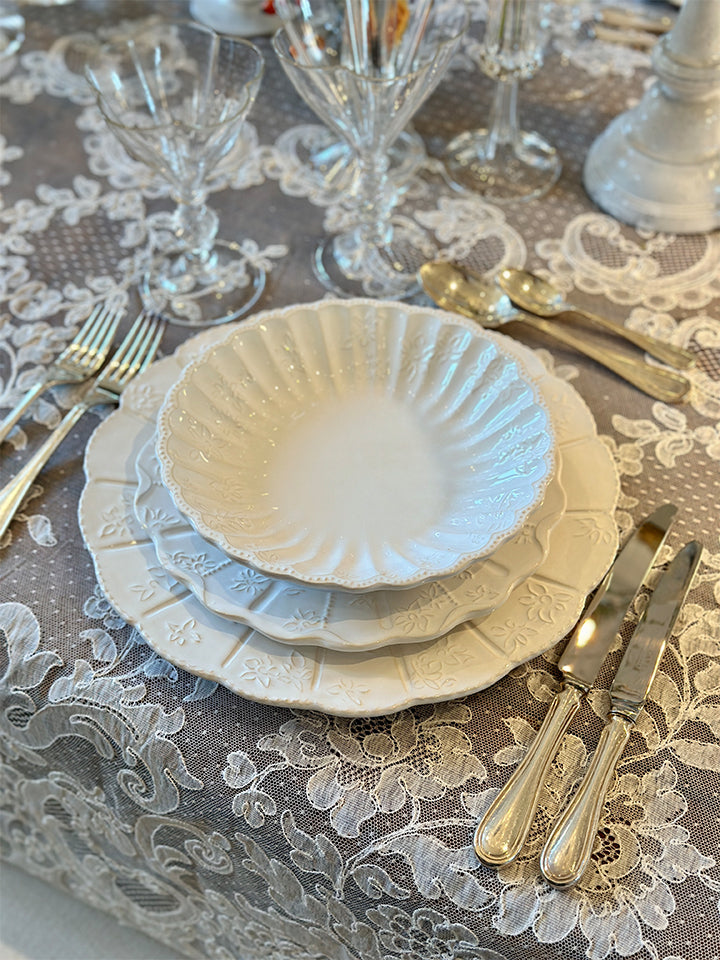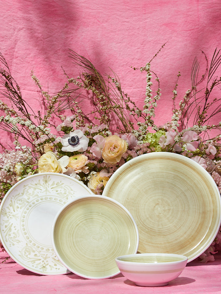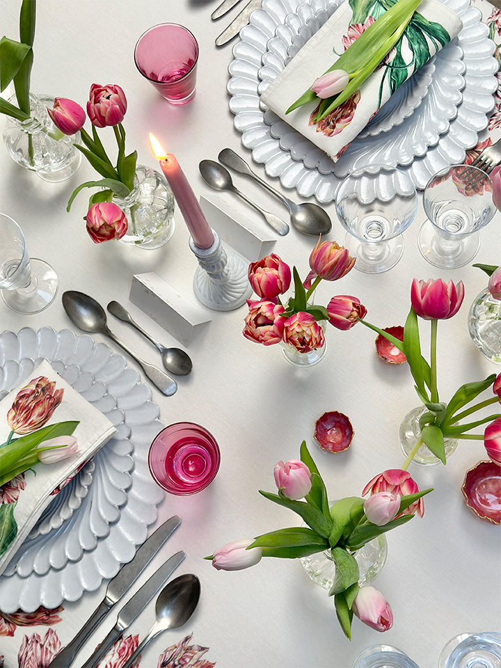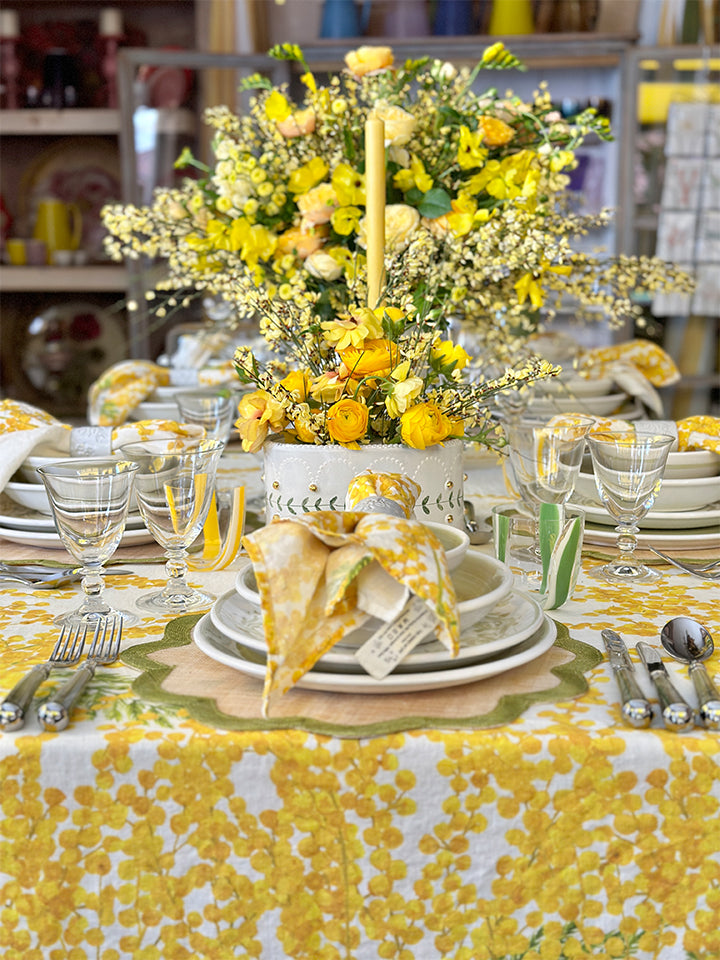 For the floral devotee, embrace maximal spring. Think abundant blooms, layered with delicate embroidery and garden-inspired patterns. Tulip or Mimosa create a joyful, blooming backdrop for a long, languid lunch. Here, more is more — mix florals, sprinkle posies at each place, and match with etched glass and gold-trimmed plates.