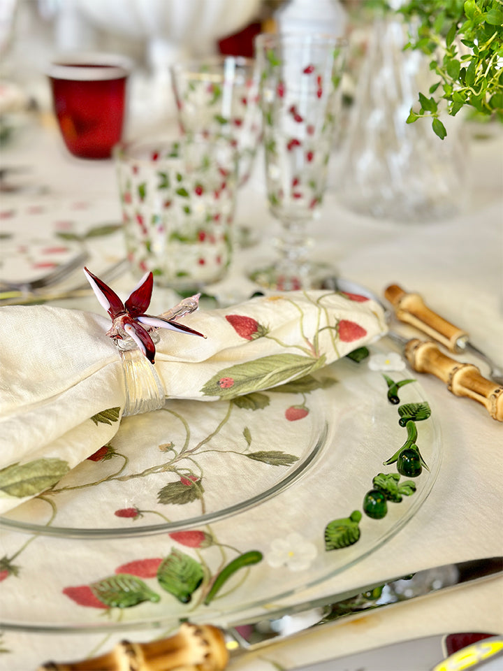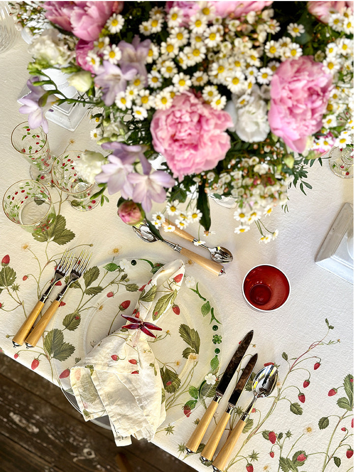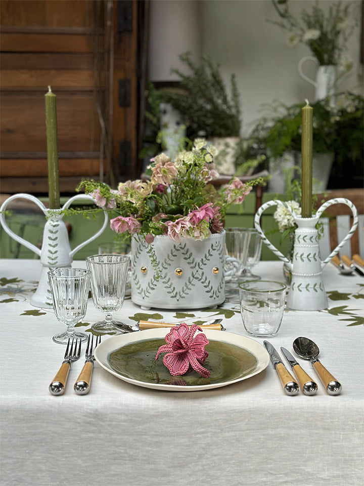 For the minimalist drawn to symbolism, let the linen echo the purity of the season. White-based linens like L’Olivier, Passiflora or Fraises des Bois make space for objects with meaning. Add ceramic eggs, olive branches, and natural textures. This is a table composed with quiet intention.