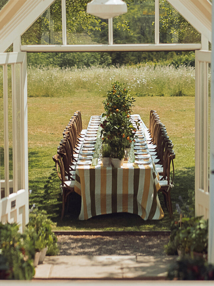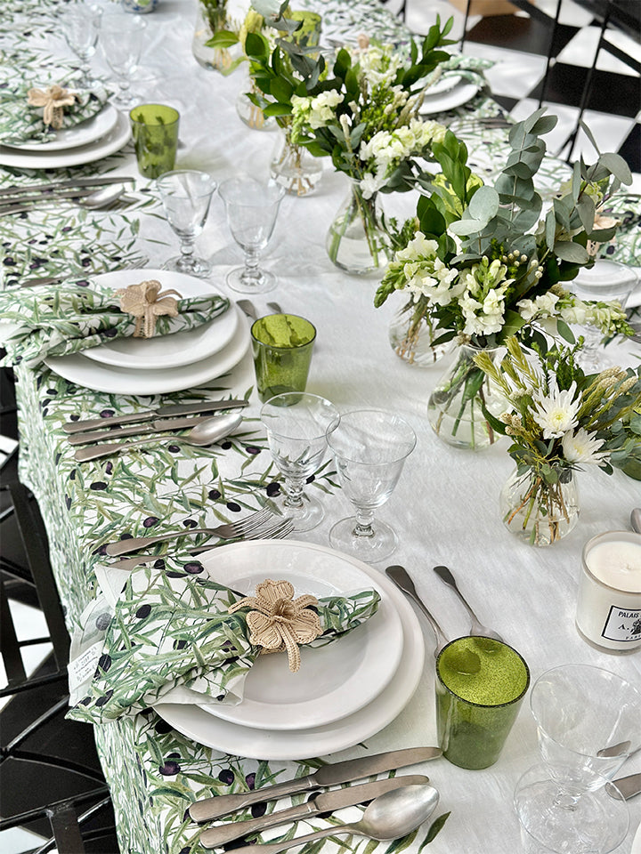 For something timeless and romantic, opt for art deco patterns that whisper of the natural world. Our Gleneagles table linens lend a quiet grandeur, transforming the table into a canvas of renewal. Pair with elegantly draped napkins — loosely knotted, or tucked into hand-blown tumblers for an air of studied nonchalance.