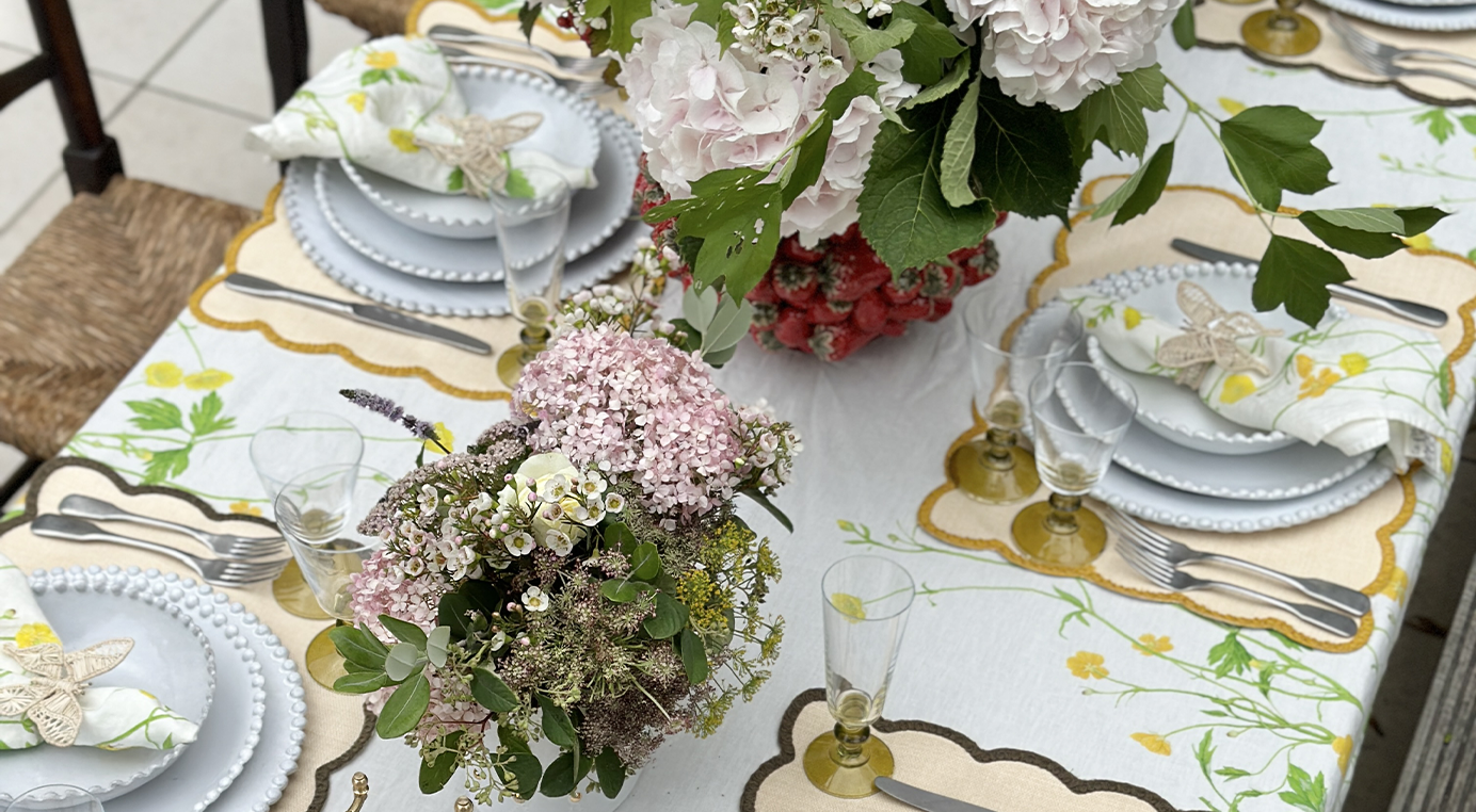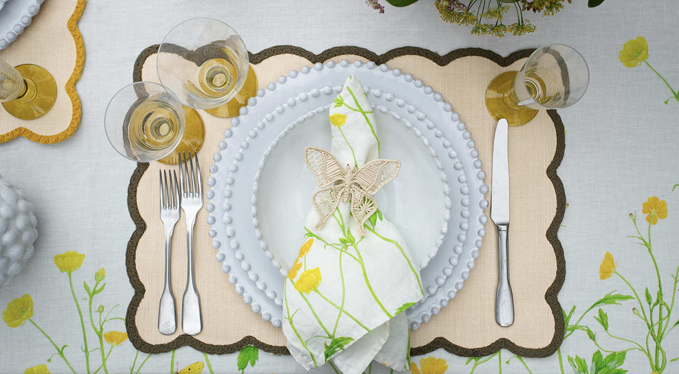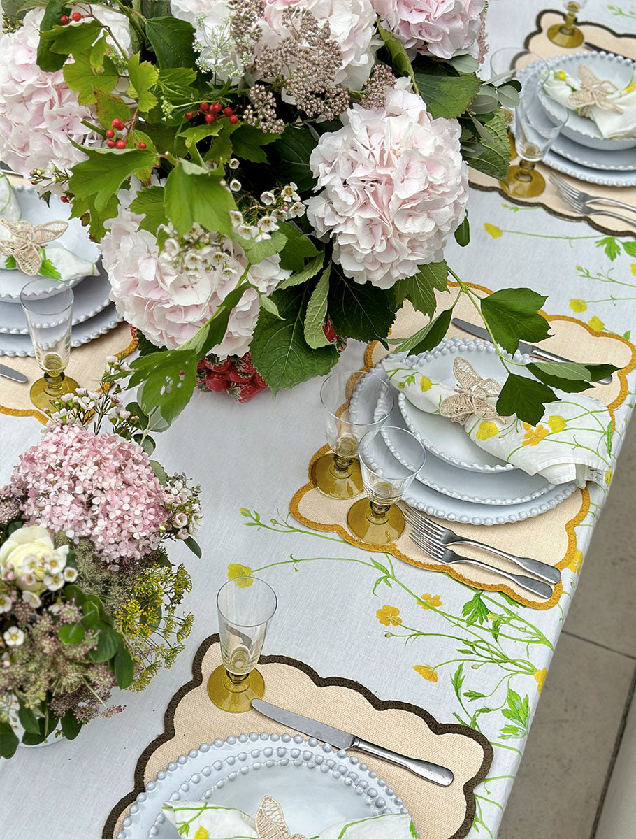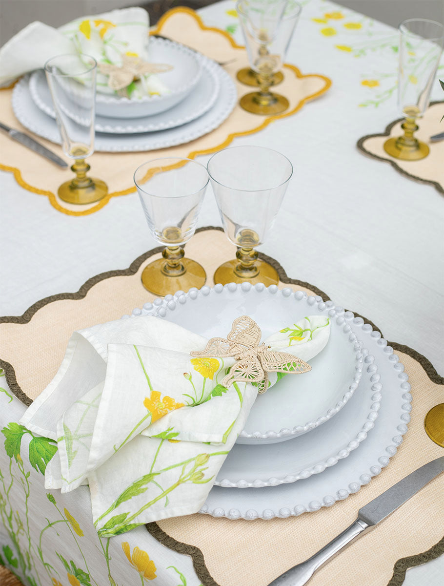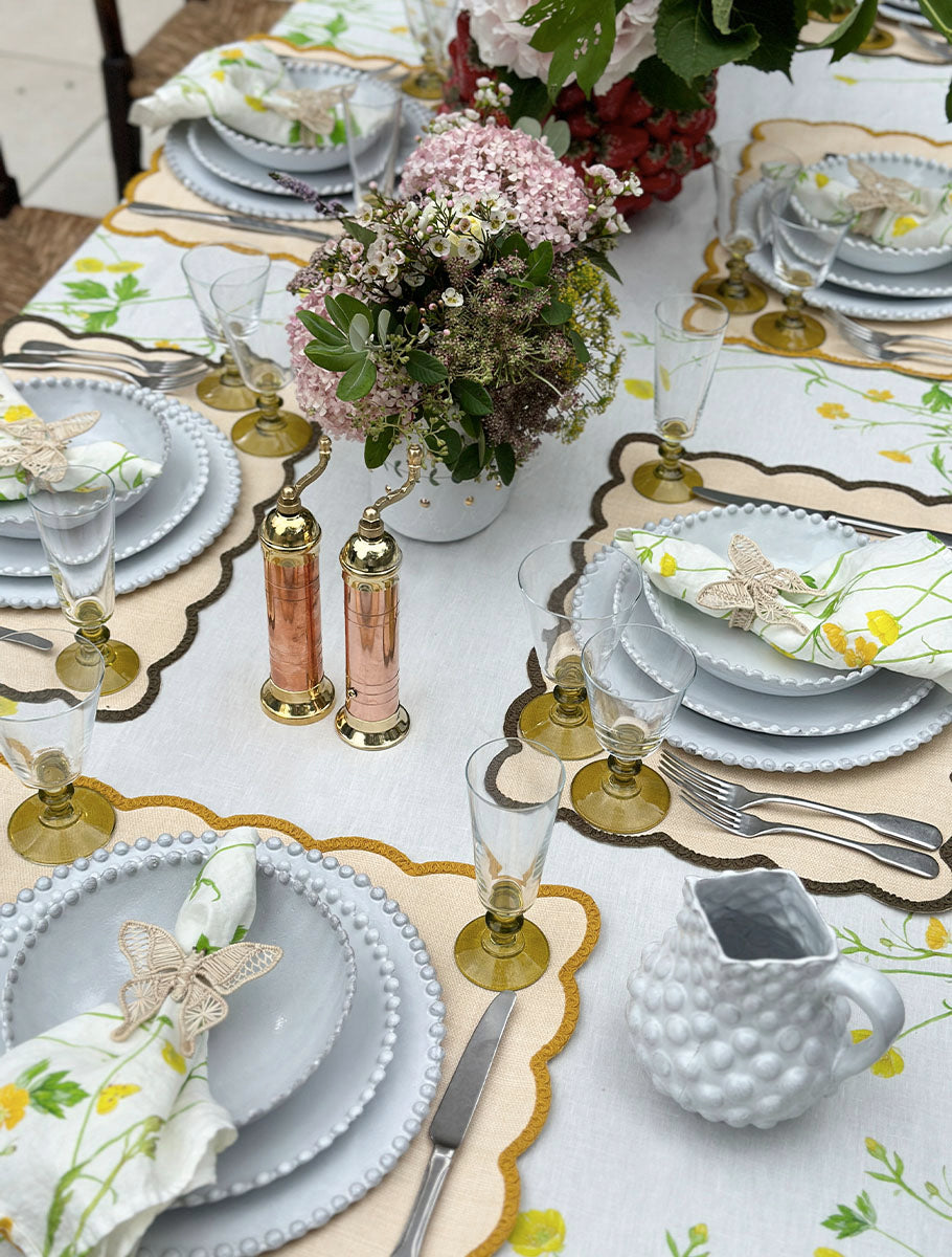 A table that flutters with quiet joy. The ‘Buttercup’ linen sets the scene in soft painterly yellow, while scalloped placemats in lemon yellow and olive green add a touch of tailored whimsy. White bobble-edged ceramics bring a playful structure, balanced by vintage-style olive glassware that catches the light. A final flourish? Buttercup napkins gathered with raffia butterflies - delicate, charming, and just a little bit magical.