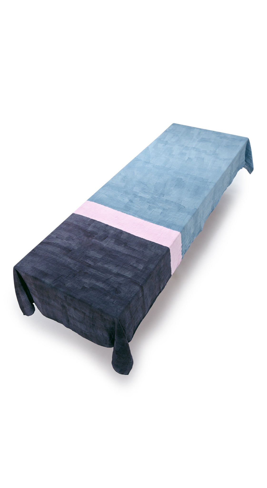With Italian linen hand painted in blue, pink and grey, it's ideal for autumnal meals outdoors or for a splash of fun indoors during the cooler months.