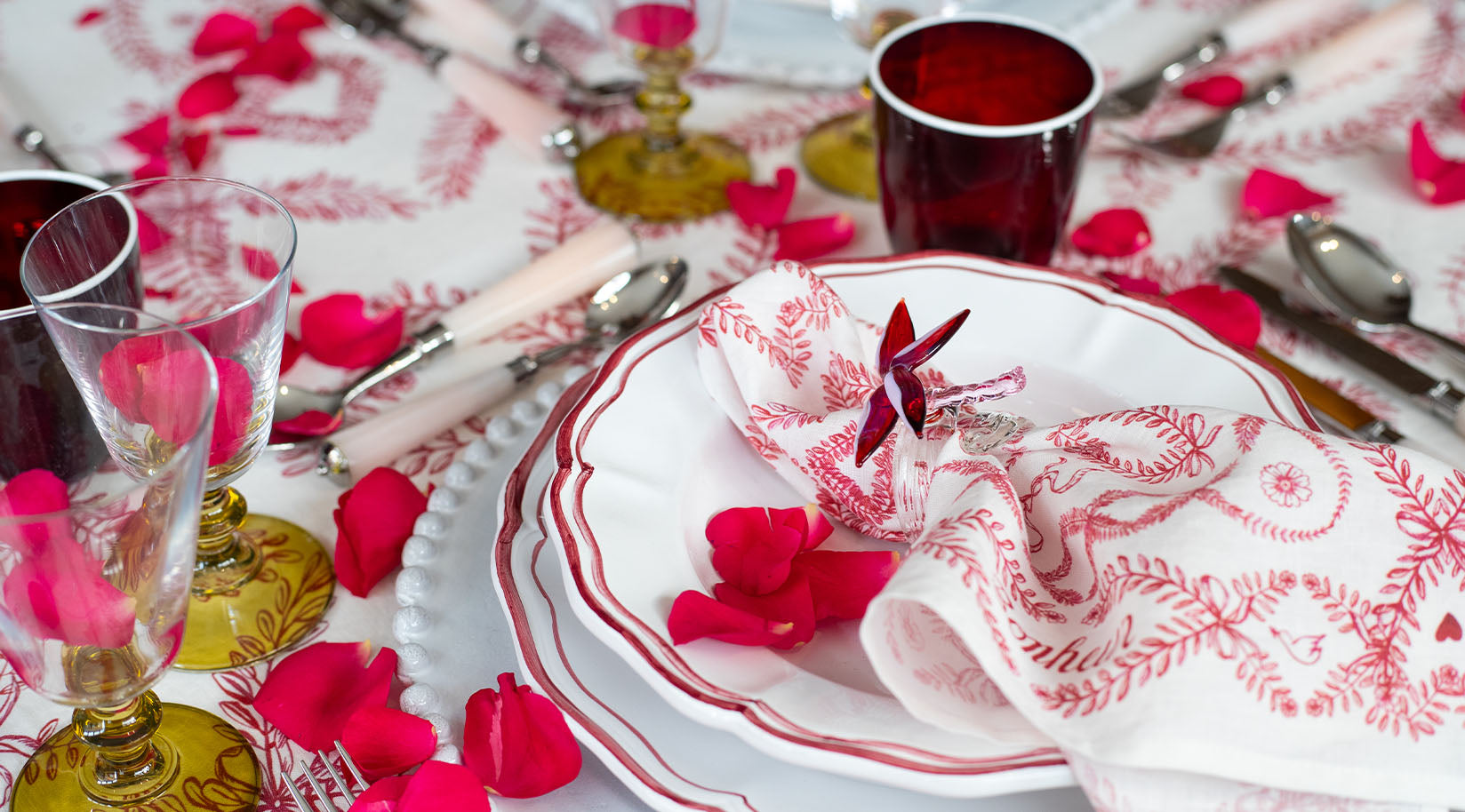 “Amour Bonheur,” means "Love and Happiness,” and that is what we would like to wish upon you and your loved onesthis festive season. Our Amour Bonheur collection is an homage to the little moments shared around the table, that we cherish for years to come. The enchanting illustrations that grace this delightful design have a charming, hand-painted allure, inspired by a vintage Summerill & Bishop glass tumbler etched with the words ‘Amour Bonheur.’ Hidden treasures lie within the ornate patterns: sweet hearts symbolize ‘love,’ while those very hearts unite to form clovers, embodying luck and echoing the joy of happiness. Olive branches and leafy vines weave together in endless chains, signifying everlasting love, while playful bows represent bonds and the delightful notion of coming together.
