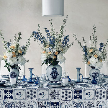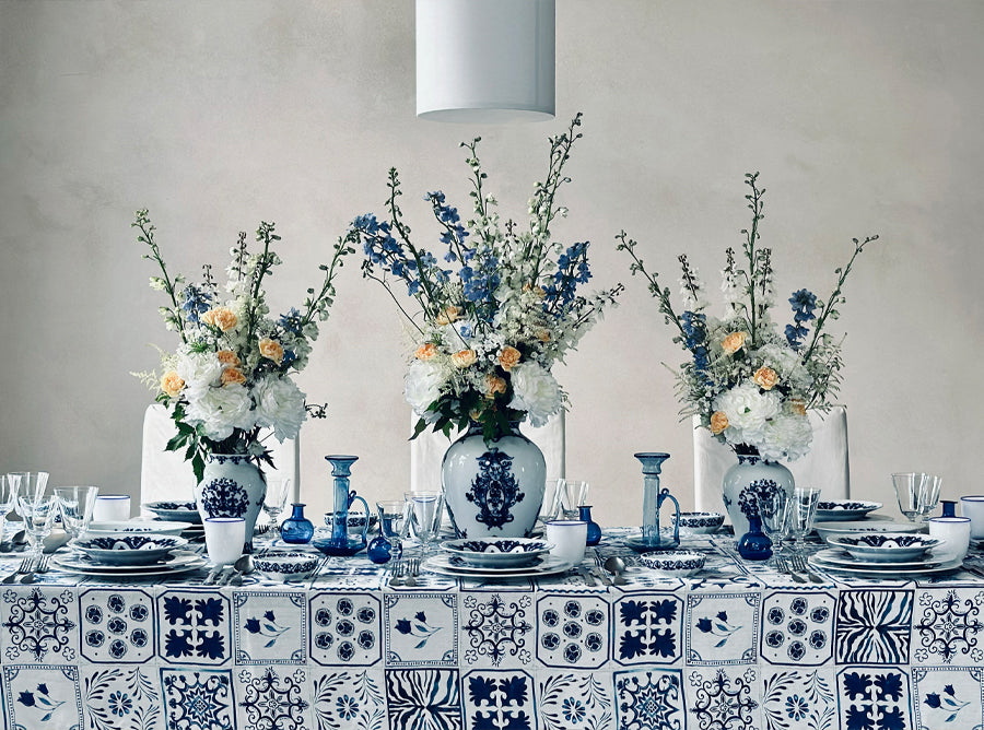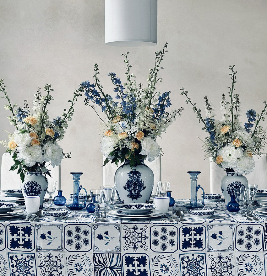Azulejos. A design that merges the beauty of traditional Portuguese Azulejos with signature Summerill & Bishop artistry. The brilliant blue and white tiles create an eye-catching allegorical scene that dances across the table. It features ornate patterns as well as subtle nods to the Summerill & Bishop heritage.