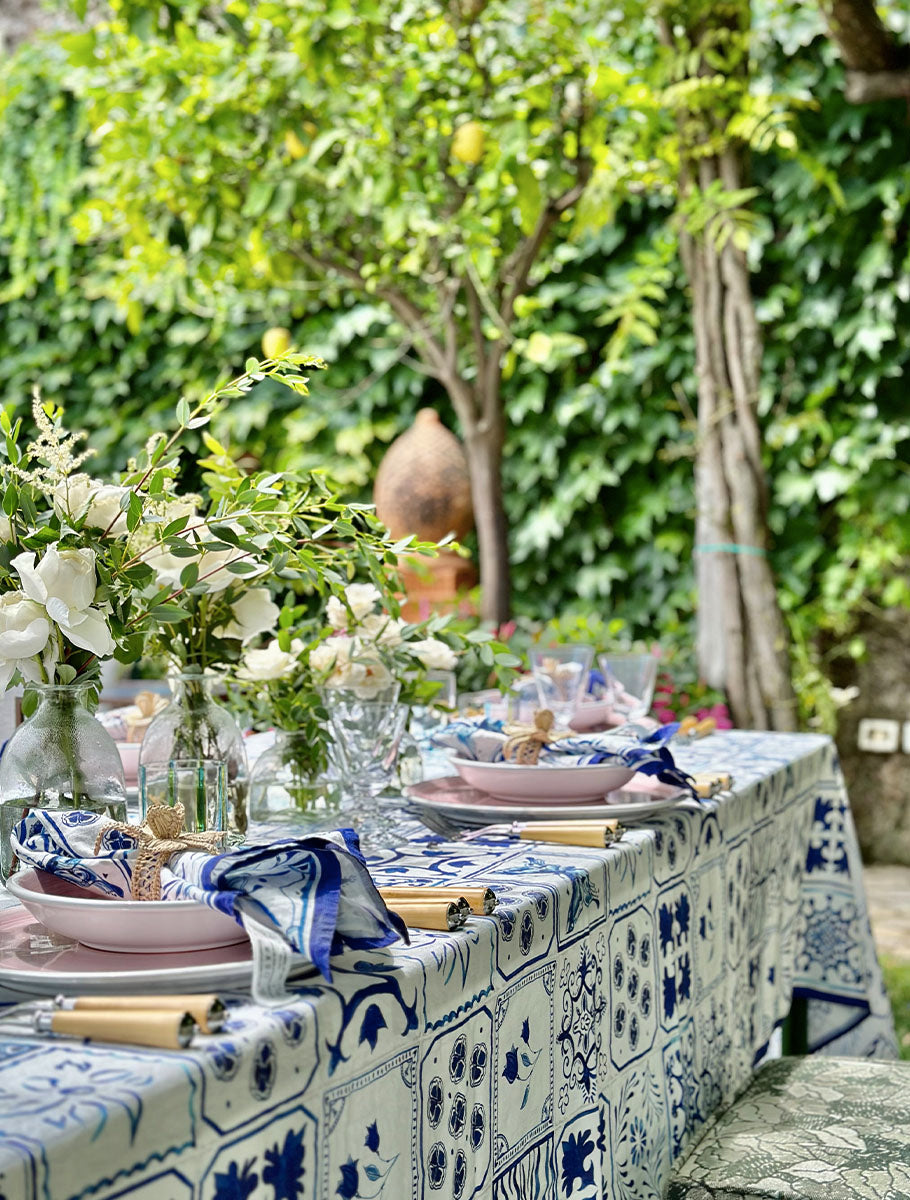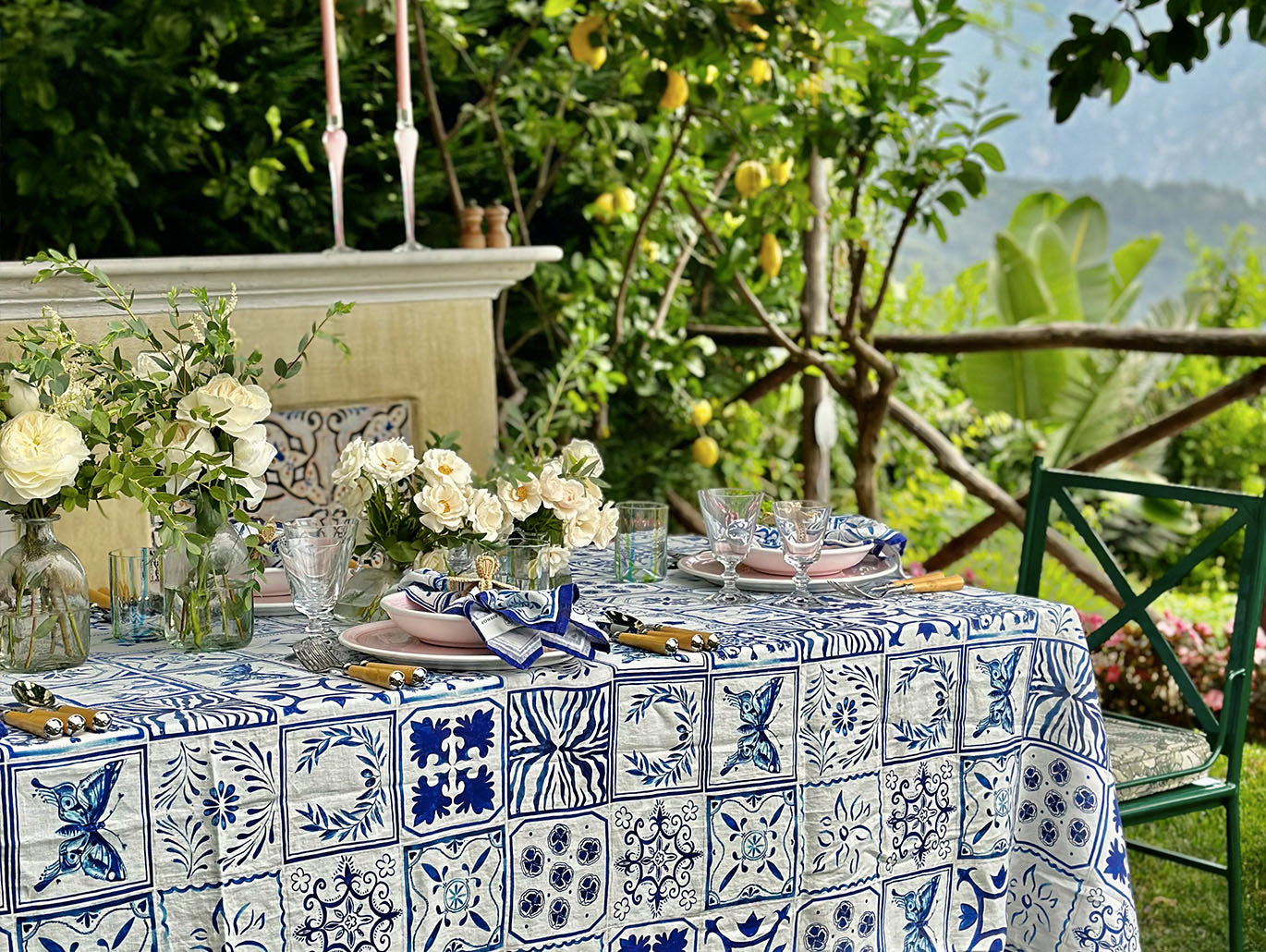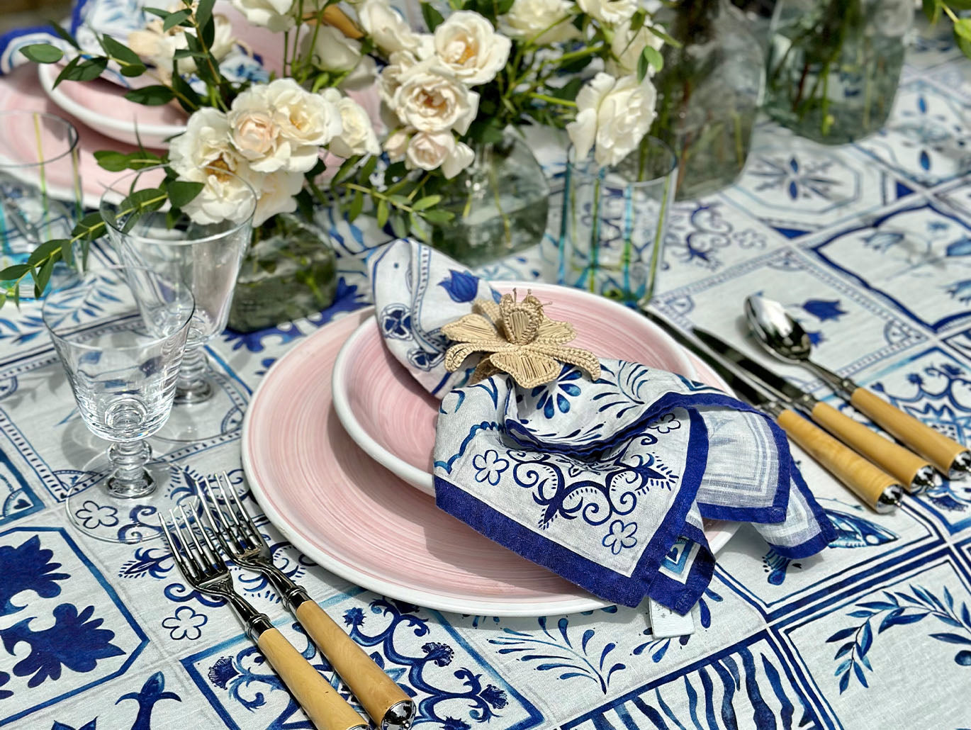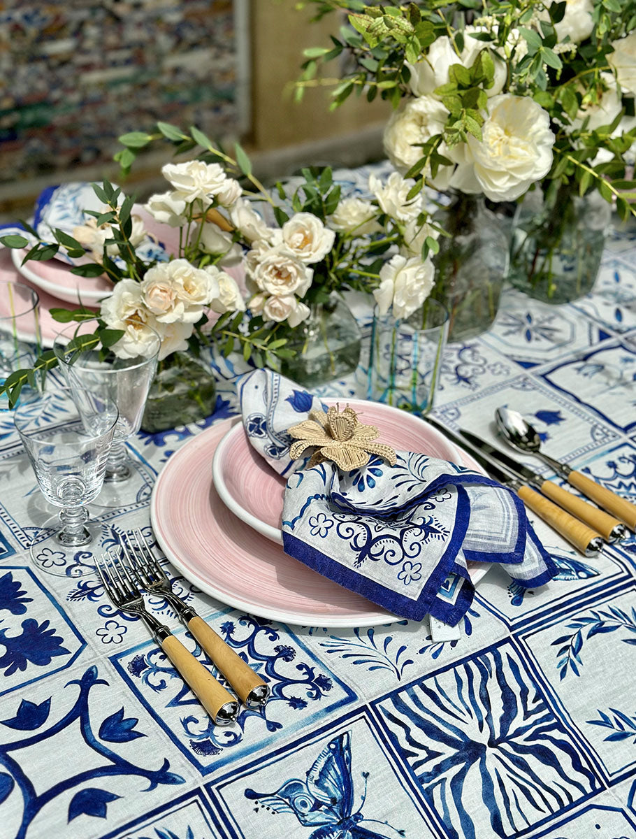 Azulejos. A design that merges the beauty of traditional Portuguese Azulejos with signature Summerill & Bishop artistry. The brilliant blue and white tiles create an eye-catching allegorical scene that dances across the table. It features ornate patterns as well as subtle nods to the Summerill & Bishop heritage.