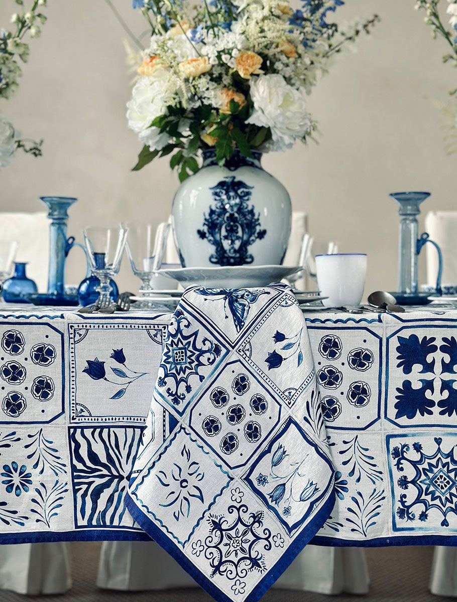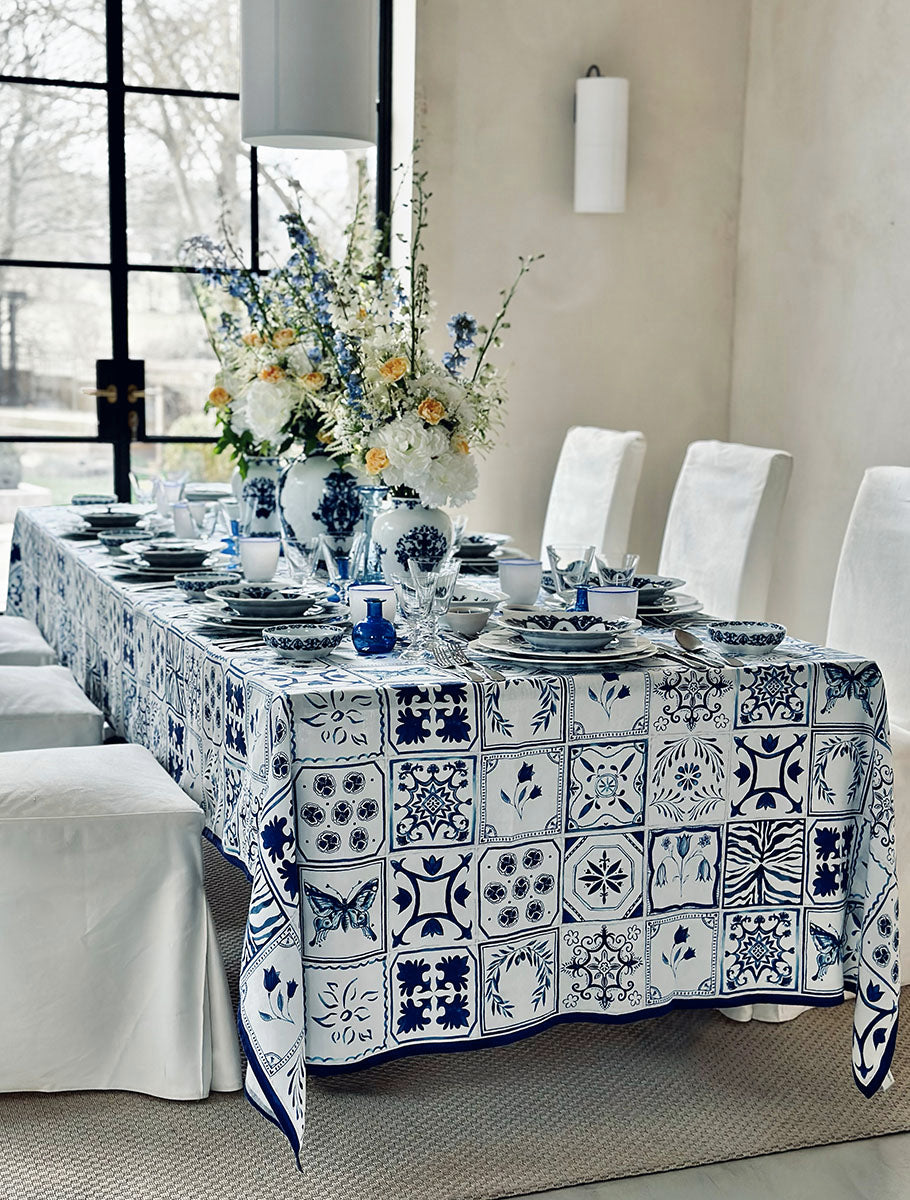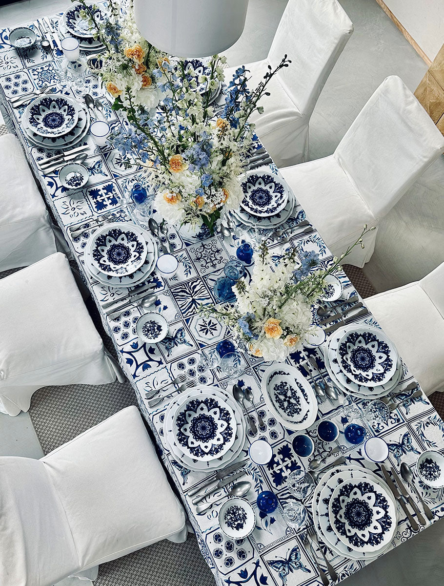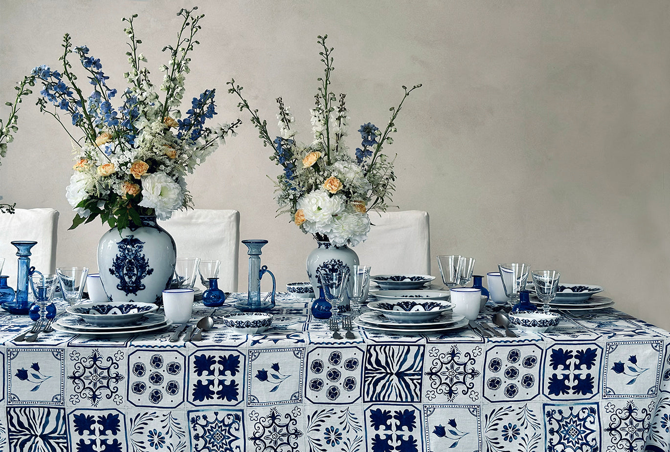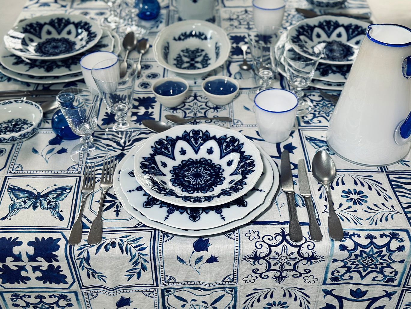 Azulejos. A design that merges the beauty of traditional Portuguese Azulejos with signature Summerill & Bishop artistry. The brilliant blue and white tiles create an eye-catching allegorical scene that dances across the table. It features ornate patterns as well as subtle nods to the Summerill & Bishop heritage.