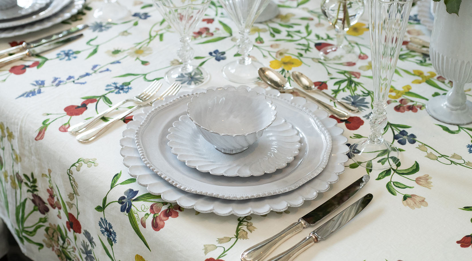 Petals, stems, blossoms from John Derian’s 18th and 19th-century botanical decoupage reimagined in Botanical Wildflower, blooming in colour and quiet charm. Let colour, form and romance gather. A table to return to, time and again.