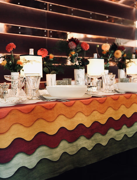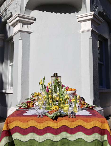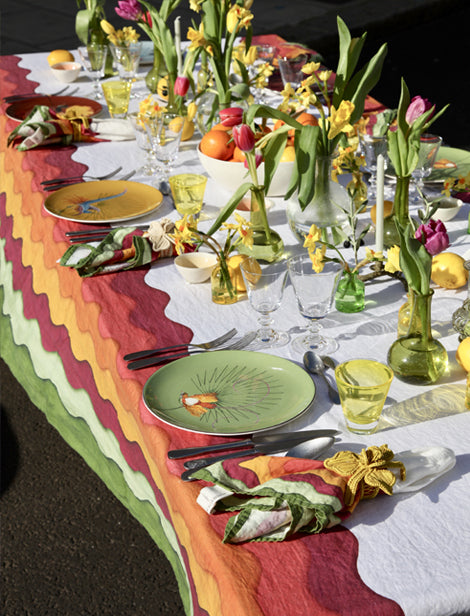 An enigmatic trompe l’oeil of a scalloped rainbow that is bound to mesmerise all that come to the table. The natural phenomena of the rainbow has always fascinated us and so we sought to recreate its beguiling nature for the table.