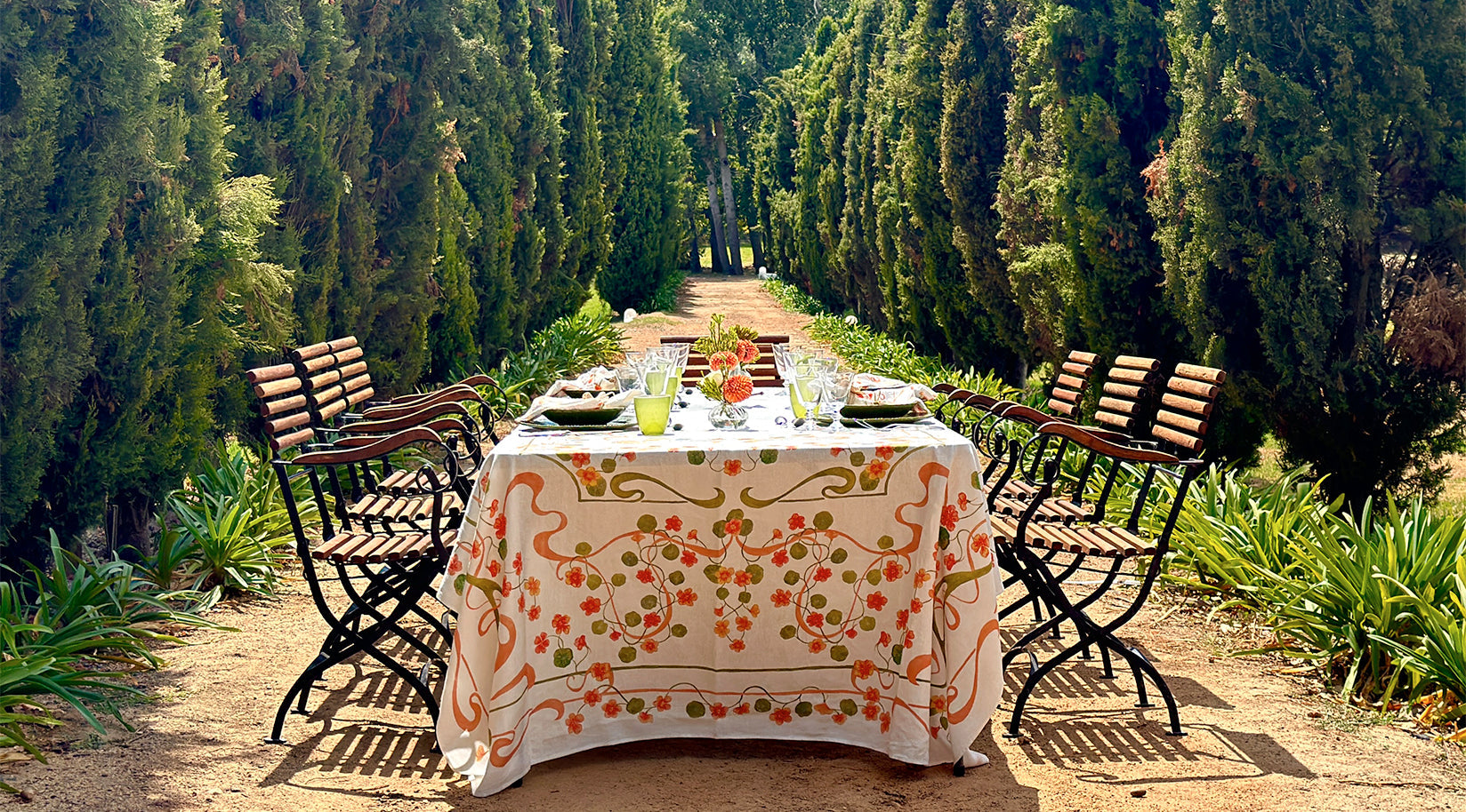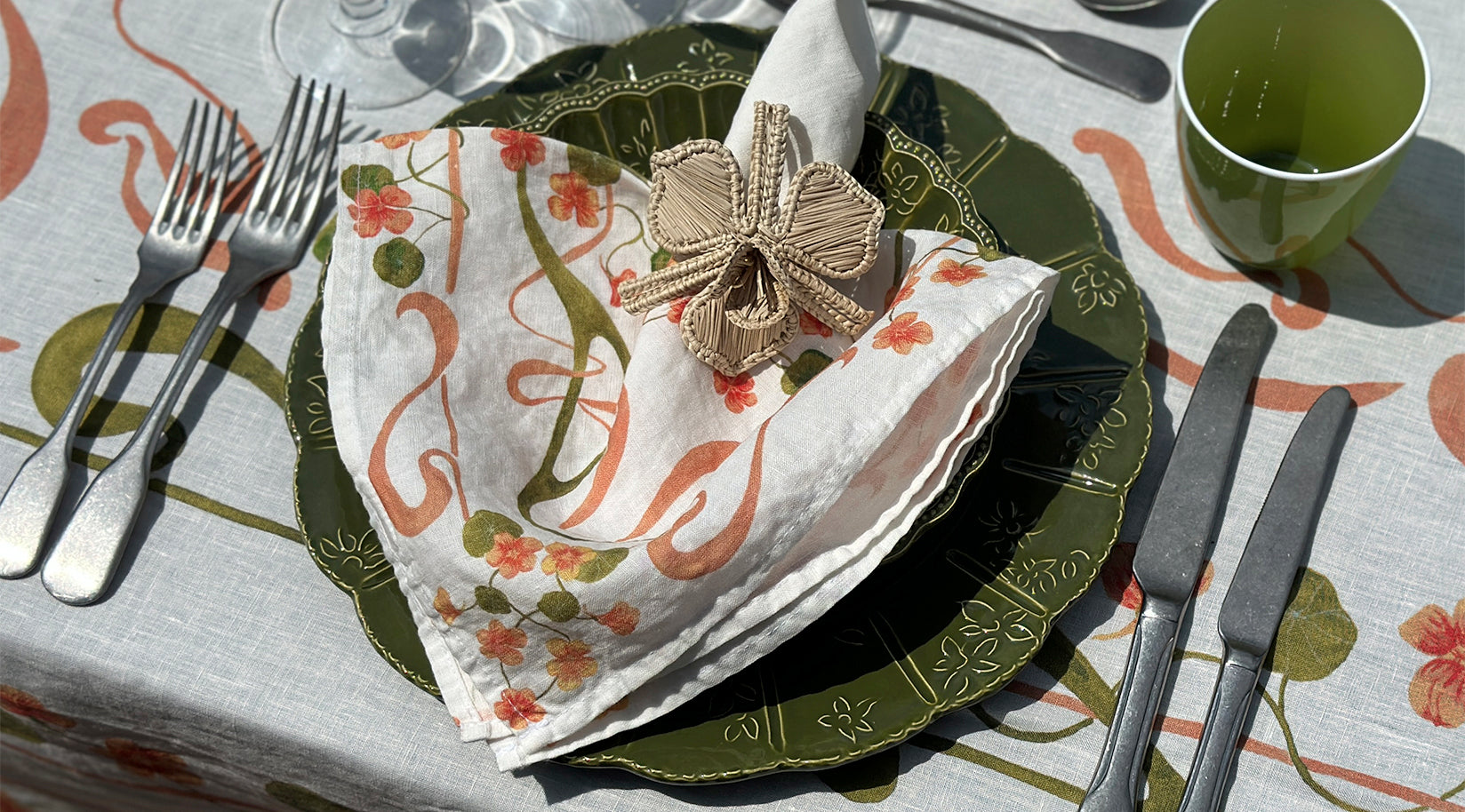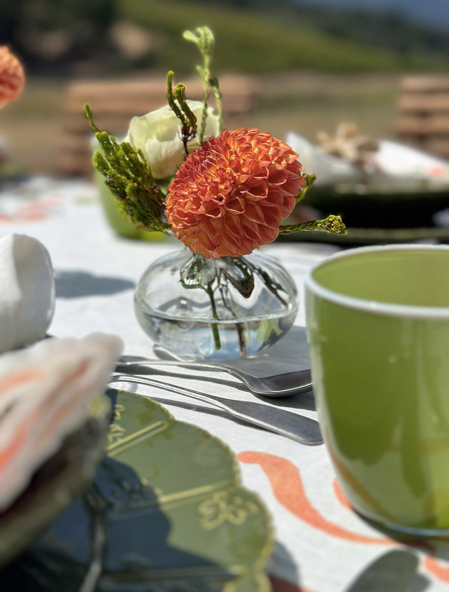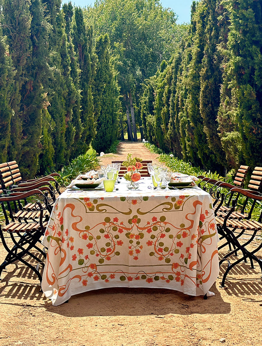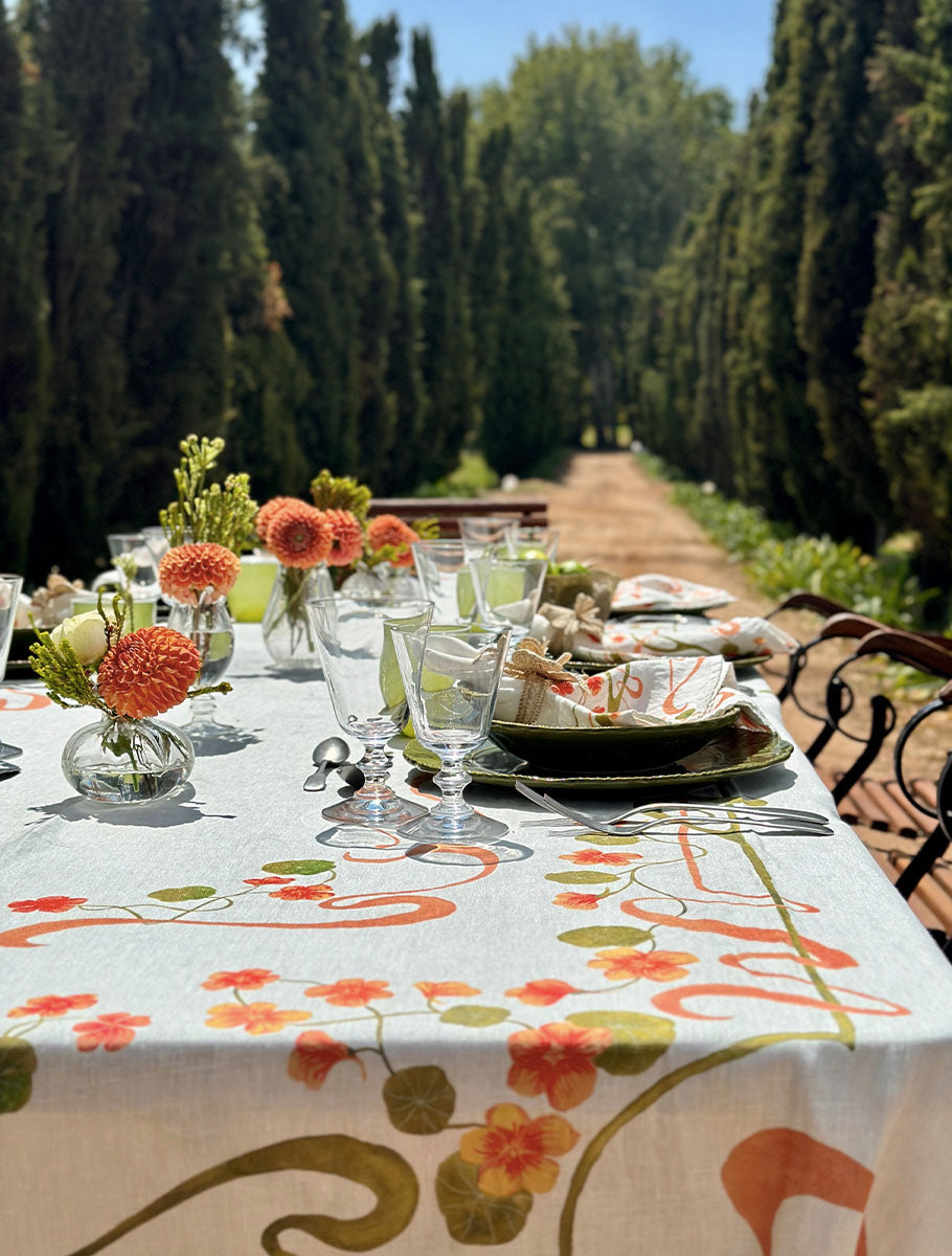 Long lunches that stretch into golden afternoons. Tables laid under trees with chilled rosé and ripe fruit. This is where Capucines comes into its own. The collection is a joyful celebration of summer dining, with a bold Nasturtium-inspired print in coral, peach and green. Full of movement and colour, the design feels fresh, spontaneous and made for entertaining under the open sky. Printed on 100% French linen, the Capucines tablecloth and napkins are designed to lift every occasion, from casual picnics to elegant outdoor suppers. Available now, ready for your next gathering.