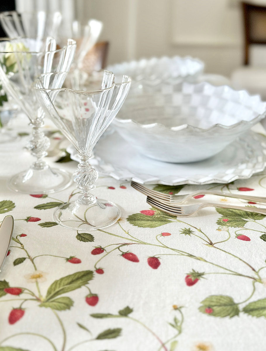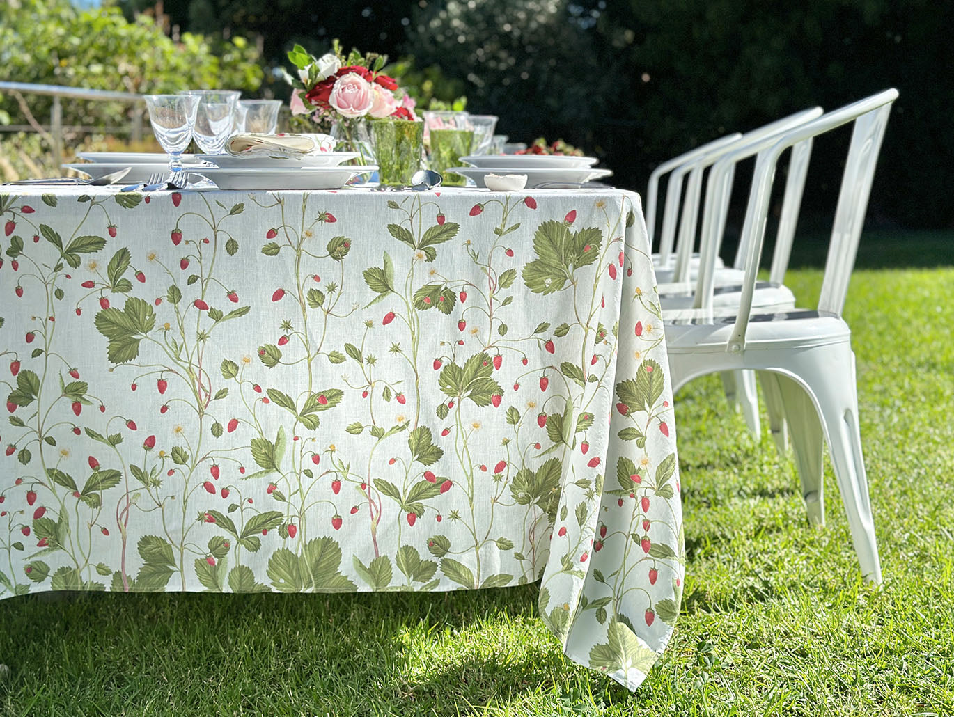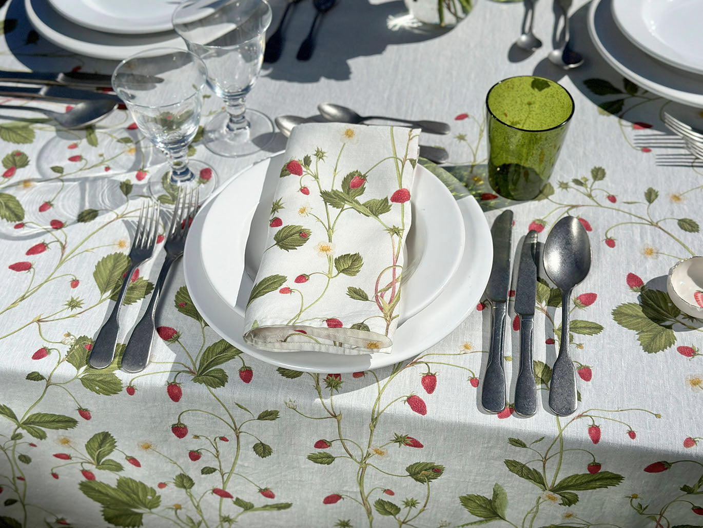 Introducing 'Fraises des Bois', where the wild beauty of nature meets the artistry of botanical illustration. Inspired by the delicacy that are wild strawberries, this design is both charming, whimsical, and sure to inspire some nostalgia amongst those at your table this summer. The collection comprises a tablecloth, available in three sizes and a matching napkin, on 100% pure French linen.