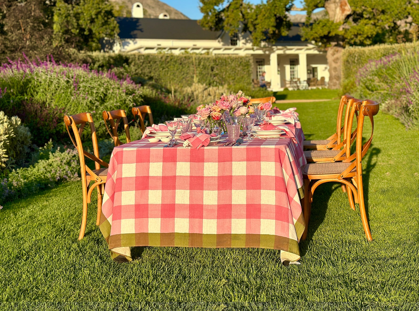 Introducing the ‘Gingham’ table linen collection – our charming homage to classic country style. This chunky check in S&B favourite rose pink with avocado green trim, is inspired by a quintessential summer; wholesome meals enjoyed outdoors and a setting sun on supper. Whether you style it cool Americana or with a nod to a beautiful English country garden, Gingham can do it all. Mix and match this tablecloth with complementing napkins in rose pink. This summer we invite you to set the table with ‘Gingham’, on the frontier that is the dining table. Sit back and enjoy the nostalgia…