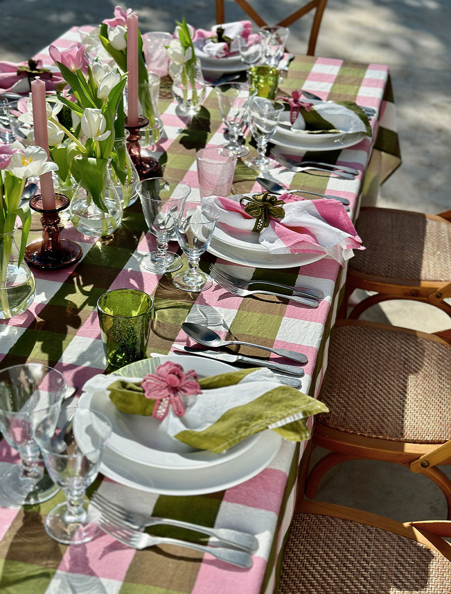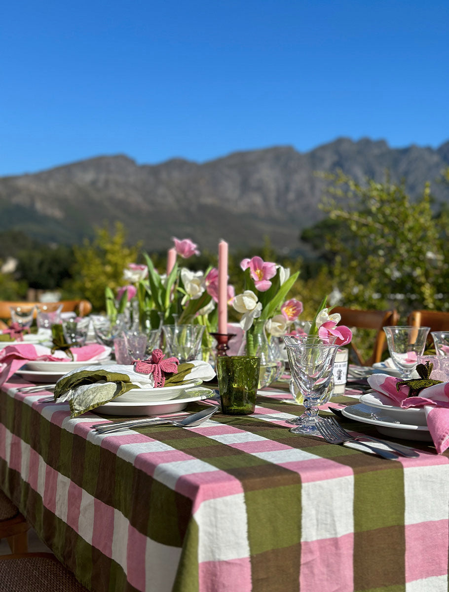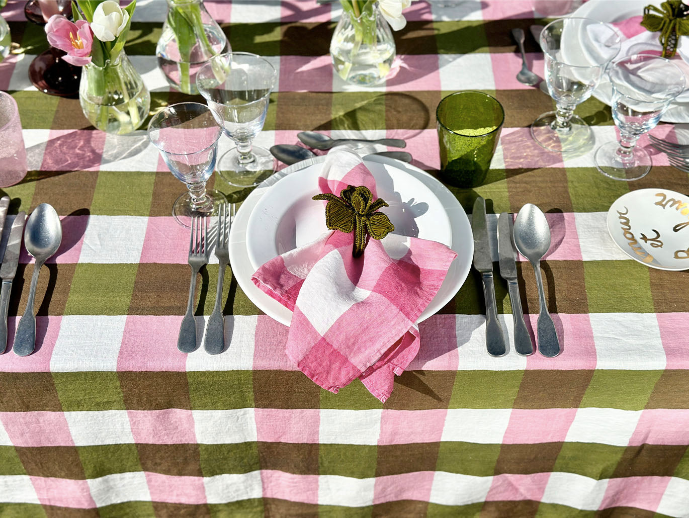 This chunky check in S&B favourite rose pink and avocado green, is inspired by a quintessential summer; wholesome meals enjoyed outdoors and a setting sun on supper. Whether you style it cool Americana or with a nod to a beautiful English country garden, Criss Cross Gingham can do it all. Mix and match this tablecloth with complementing napkins in rose pink and avocado green. This summer we invite you to set the table with ‘Criss Cross Gingham’, on the frontier that is the dining table. Sit back and enjoy the nostalgia…