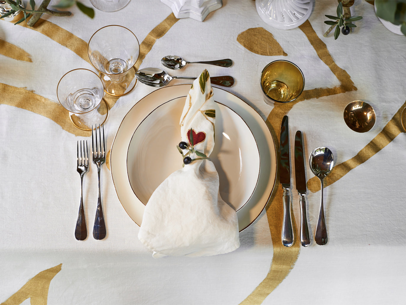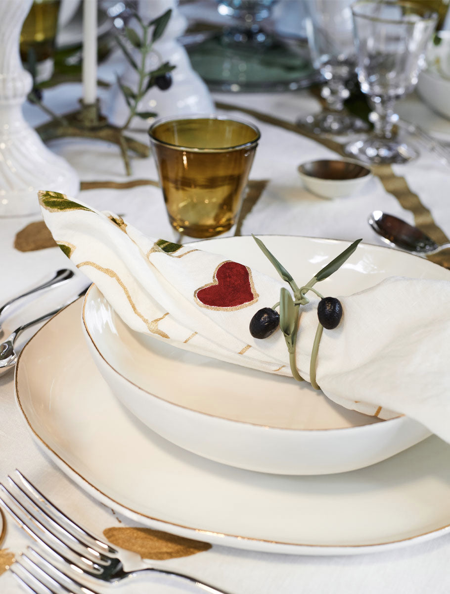 Our signature 100% Italian linen tablecloth with a pair of hand painted and expressive doves in fluid strokes of gold with a beautiful red heart and olive branch.