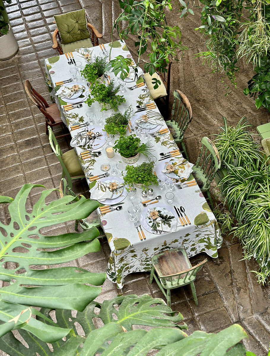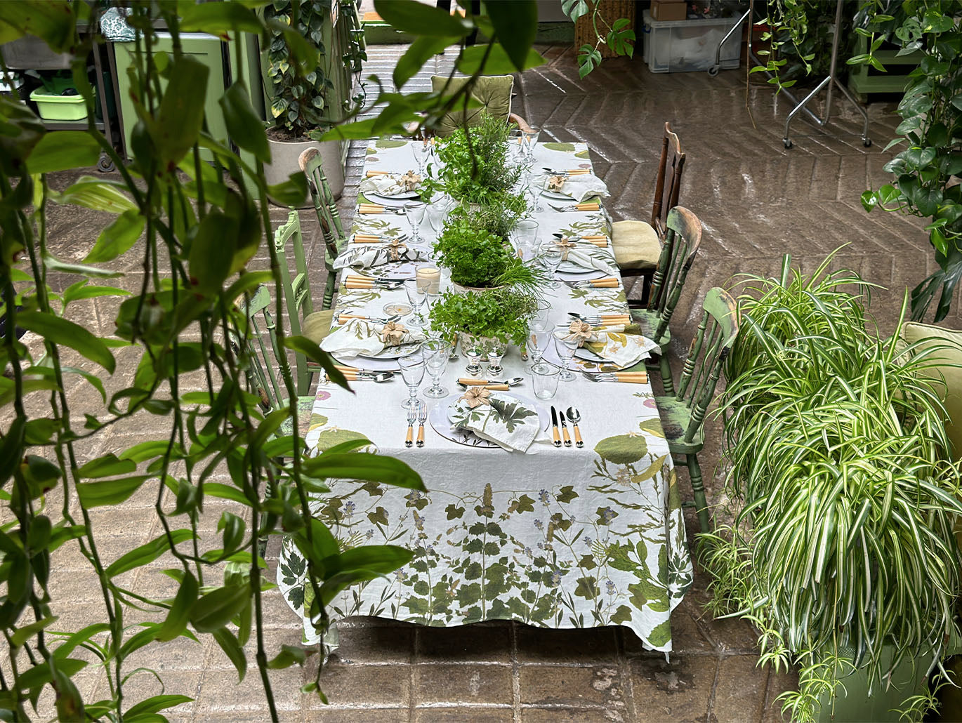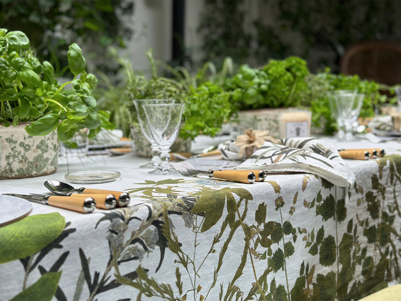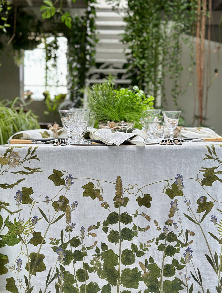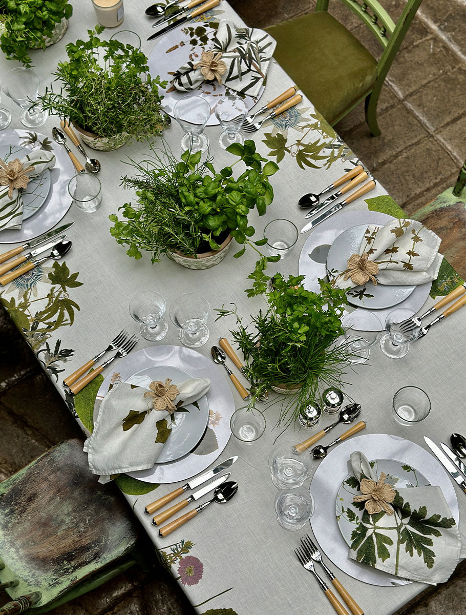 Embark on the journey along the garden path and discover yourself surrounded by the lush Foliage Oasis... Infuse your dining experience with the captivating patterns of your preferred aromatic herbs using this nature-inspired table covering crafted from 100% authentic Italian linen.
