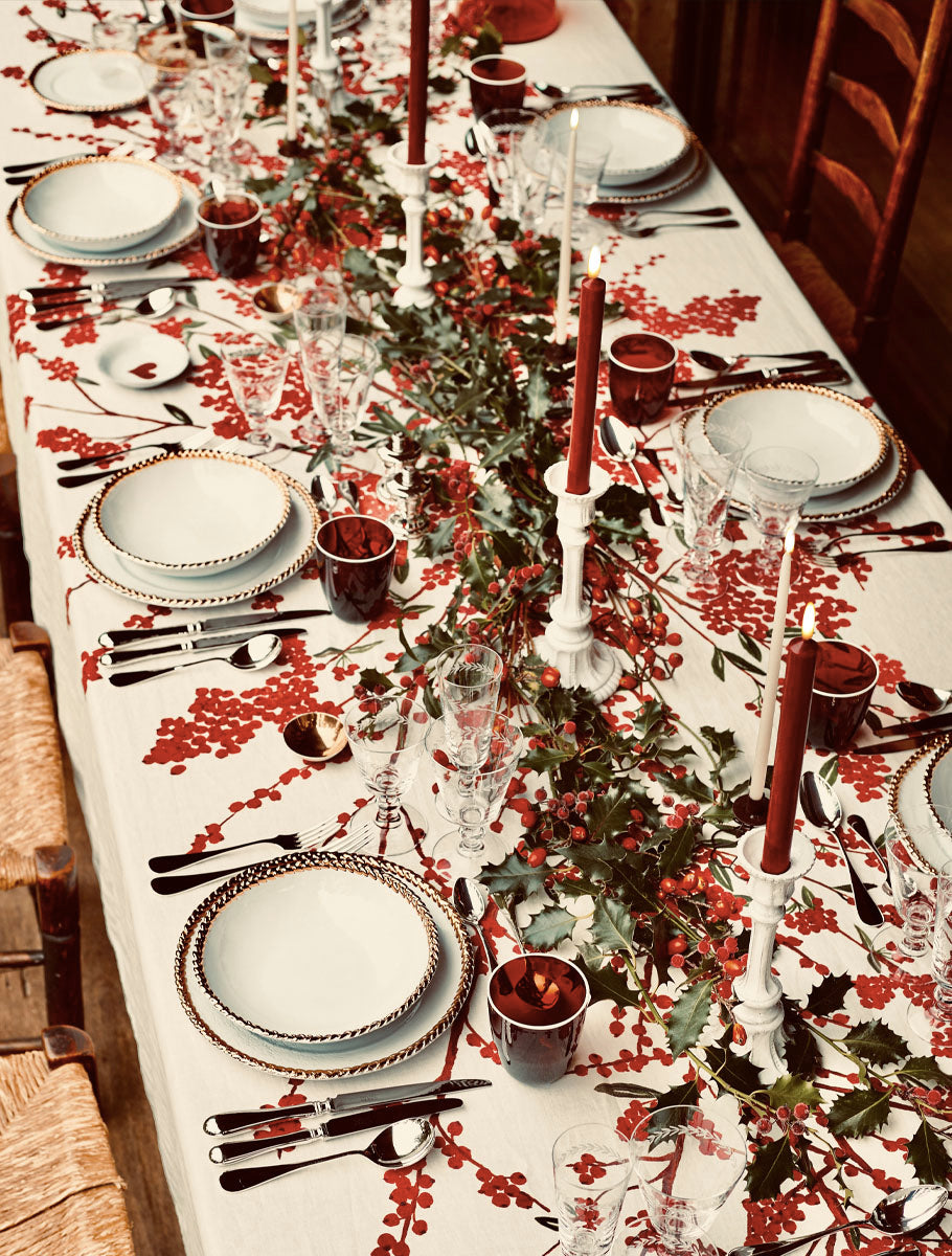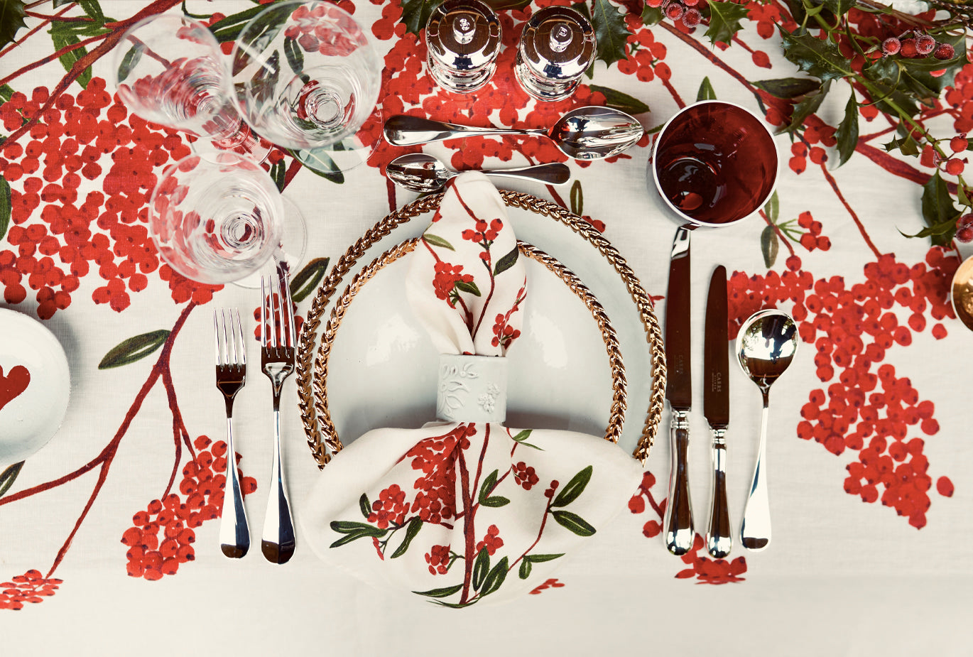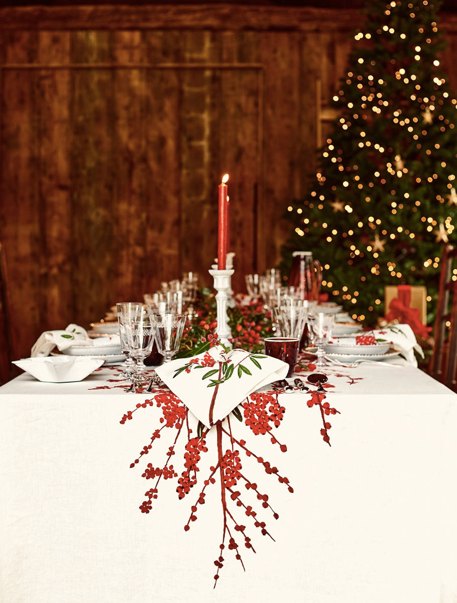 Les Airelles - Inspired by a frozen landscape dusted in the crisp white of freshly fallen snow - distant mountain peaks protrude on the horizon and whimsical, bare branches with bursts of berry, burgundy and red that temper the scene.