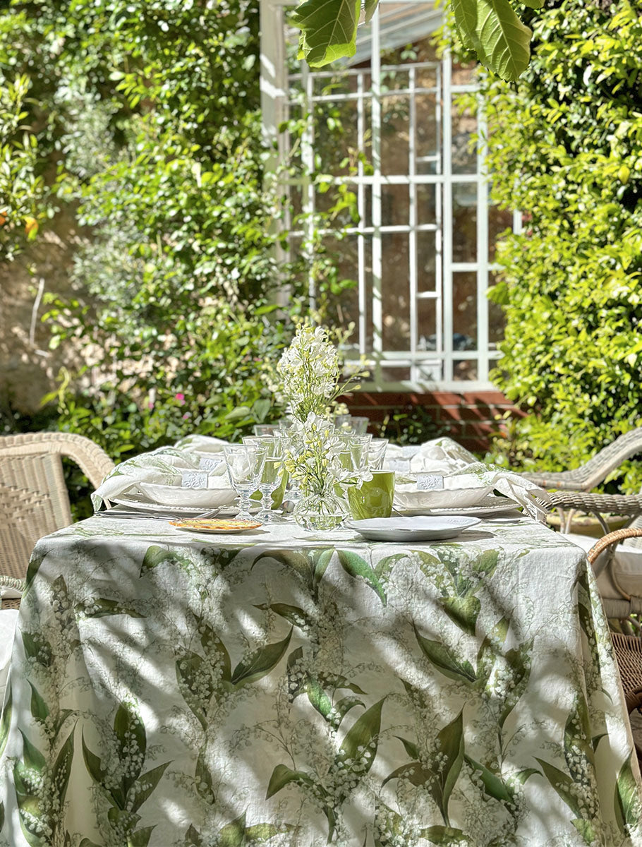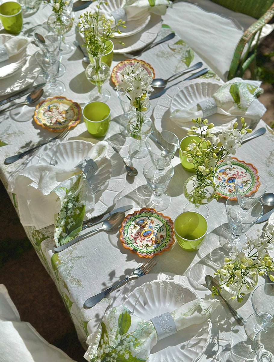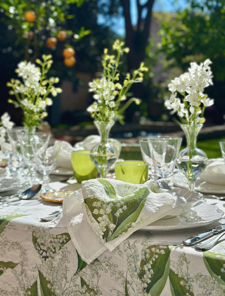 On arching stems, pearl-like ivory buds open into white bells amongst large, lush green leaves. Imagined in a soothing palette of delicate greens with white, our linen homage to Lily of the Valley is a versatile design that conjures thoughts of purity, sincerity, and happiness. A perfect muse for the table that will suit many interior and tabletop styles.