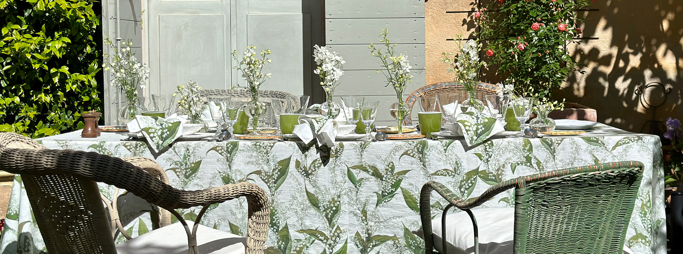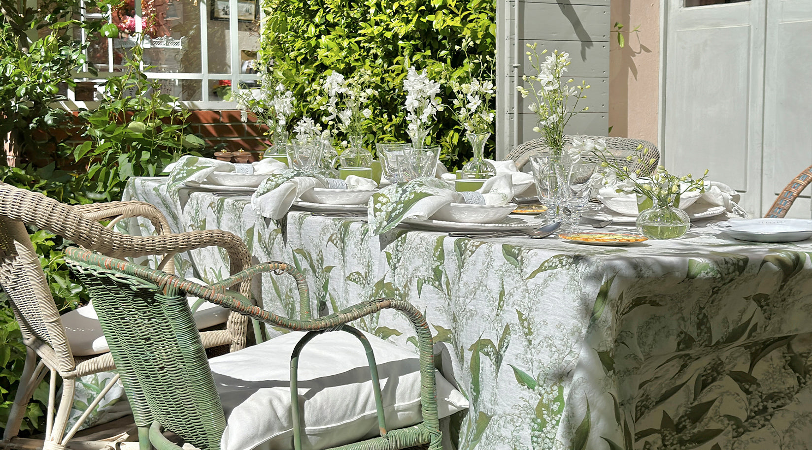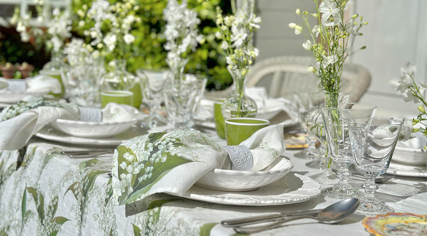 On arching stems, pearl-like ivory buds open into white bells amongst large, lush green leaves. Imagined in a soothing palette of delicate greens with white, our linen homage to Lily of the Valley is a versatile design that conjures thoughts of purity, sincerity, and happiness. A perfect muse for the table that will suit many interior and tabletop styles.