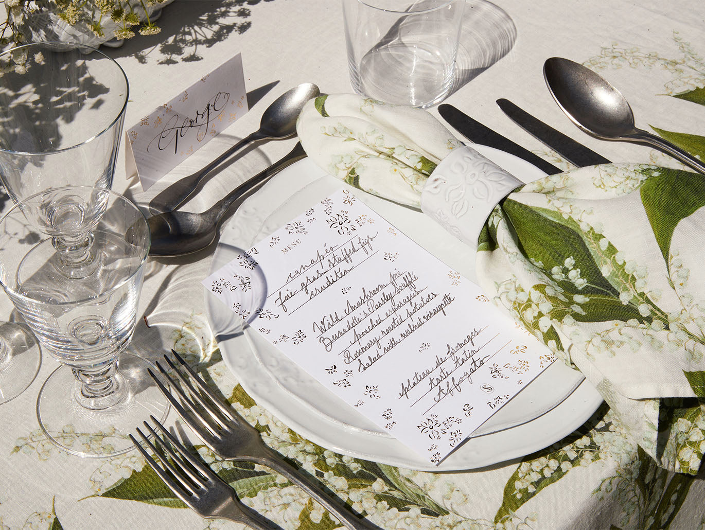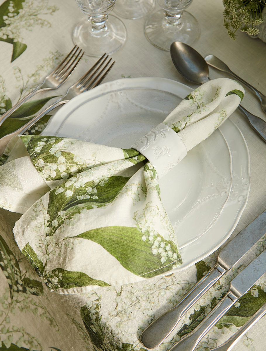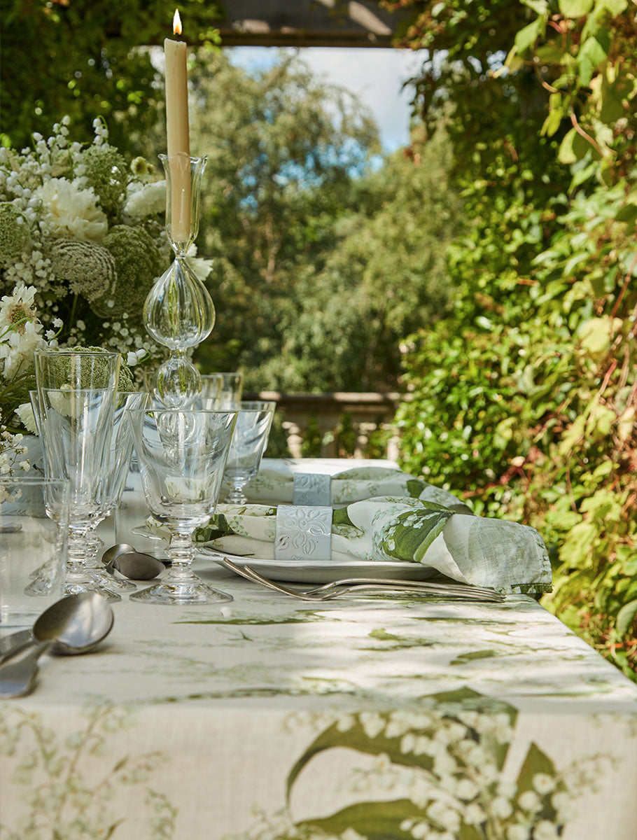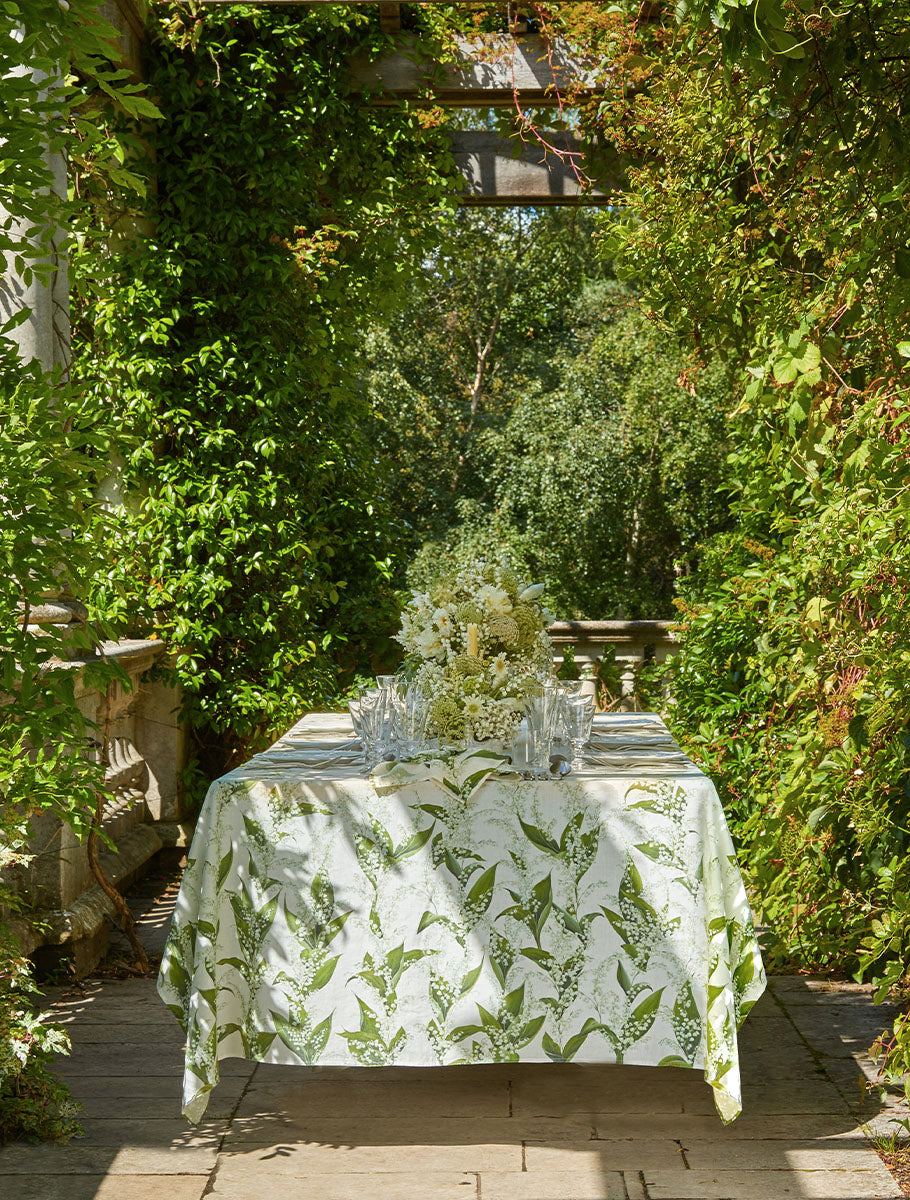 The giving of ‘muguet’ is said to bestow good luck and so to usher in the month of May, posies of the elegant white flower are traditionally given, to wish love, luck and happiness to those around you. On arching stems, pearl-like ivory buds open into white bells amongst large, lush green leaves. Imagined in a soothing palette of delicate greens with white, our linen homage to Lily of the Valley is a versatile design that conjures thoughts of purity, sincerity, and happiness.