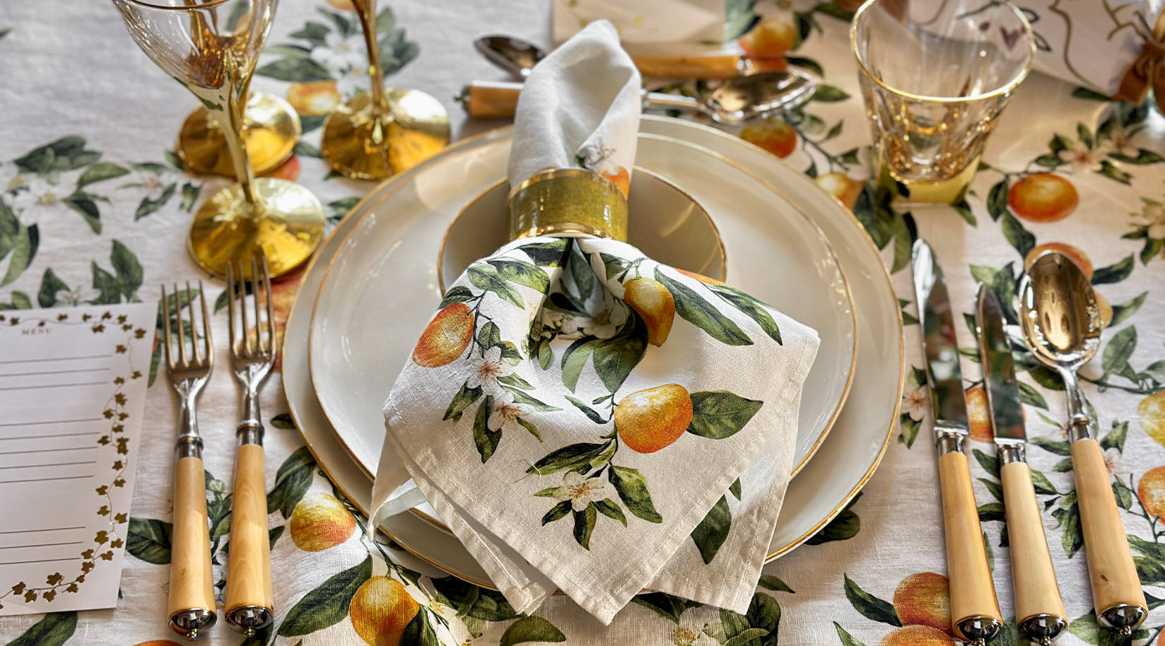 'Twas the month before Yuletide and all we can think of is hunkering down at home; warm and cosy, enjoying the pause that holiday season brings, dark December days and nights illuminated by the promise of parties and string lights. Friends are over to enjoy good food, stories and laughter as the night stretches into the crepuscular. The backdrop to all this is our L'Orangerie table linen - aglow with a delicate border of orange blossom that thoughtfully 'hugs' the table. An S&B take on the tradition of gifting oranges at Christmas time.