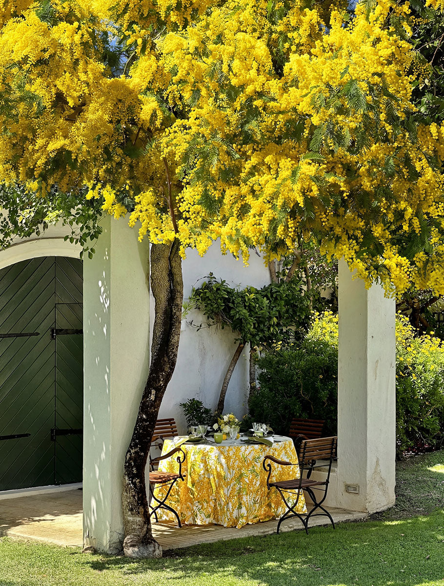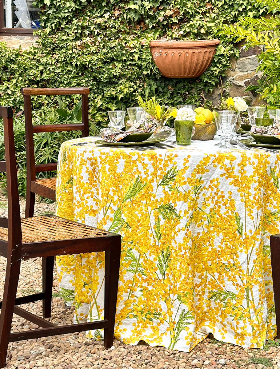 Let your table flourish with a thousand dainty suns in a riot of sunshine yellow. The blossoming Mimosa signals the dawn of spring and summer ahead and lighter, longer days. Mimosa in full bloom embellishes this 100% linen tablecloth and napkins. A glorious design to embrace the height of summer outside or inside at the table with your family and friends. Matching tablecloth is available to effortlessly coordinate your dining table.