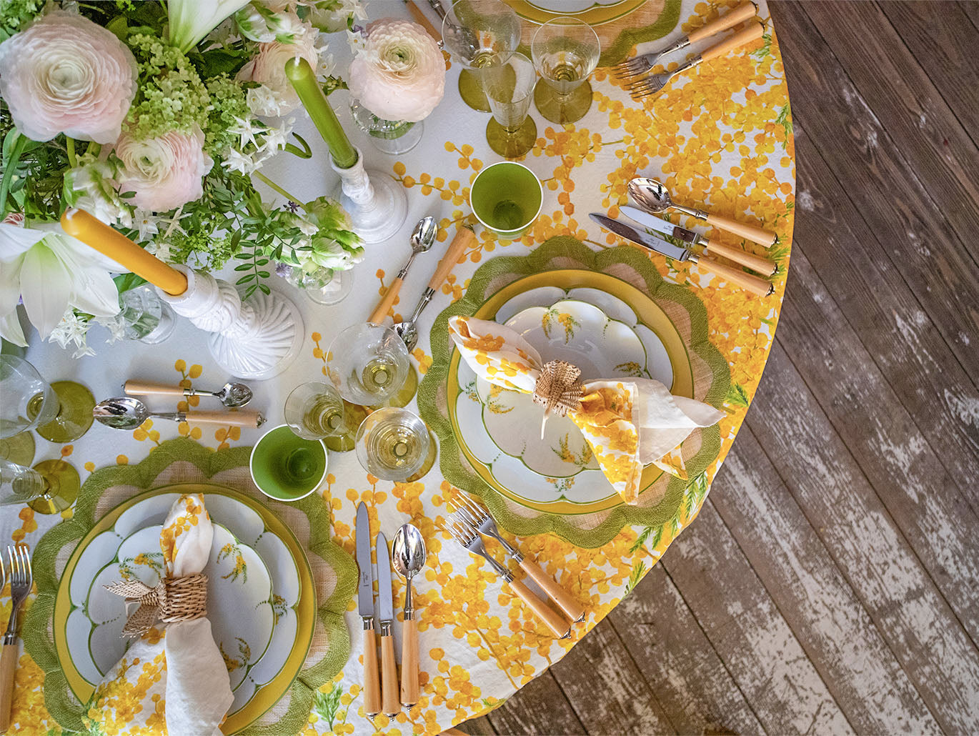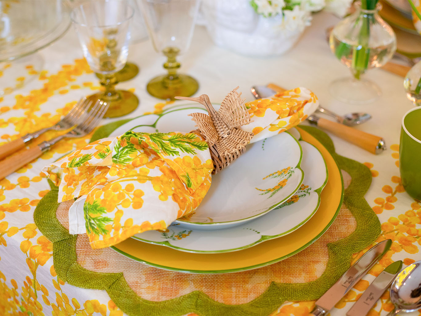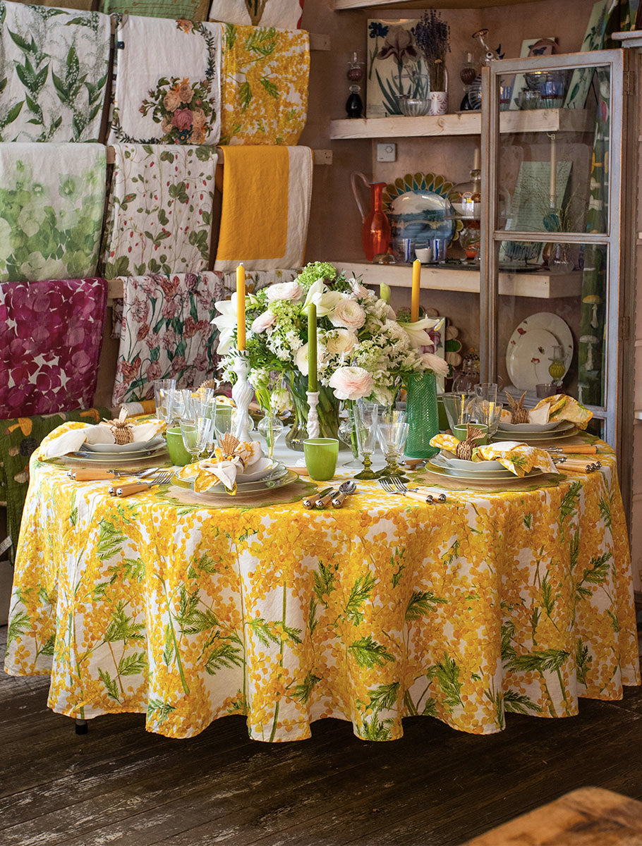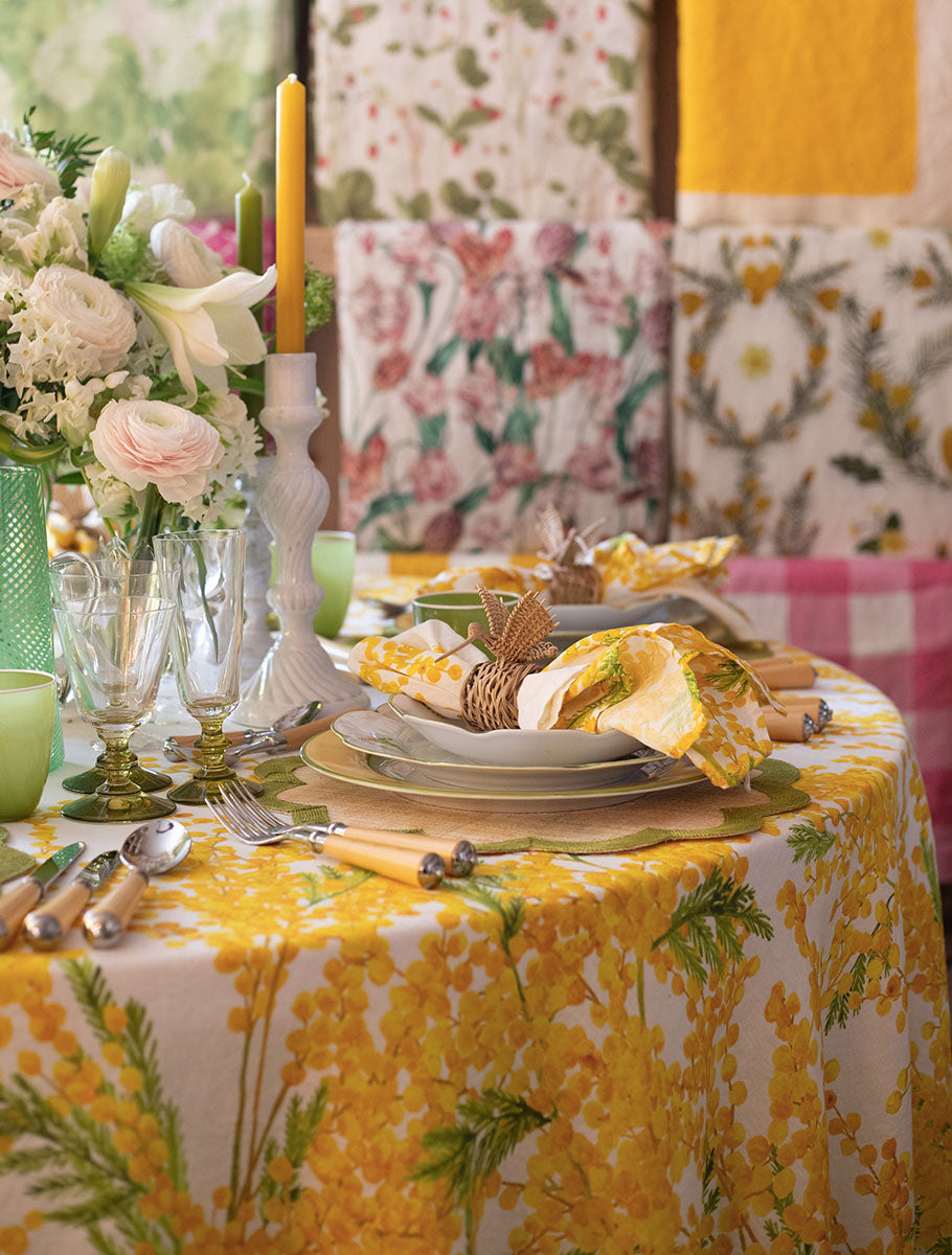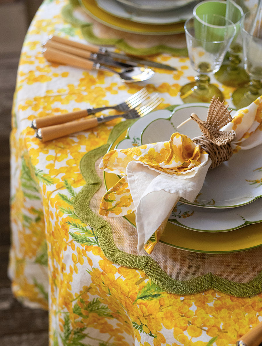 Let your table flourish with a thousand dainty suns in a riot of sunshine yellow. The blossoming Mimosa signals the dawn of spring and summer ahead and lighter, longer days. Mimosa in full bloom embellishes this 100% linen tablecloth and napkins. A glorious design to embrace the height of summer outside or inside at the table with your family and friends. Matching tablecloth is available to effortlessly coordinate your dining table.