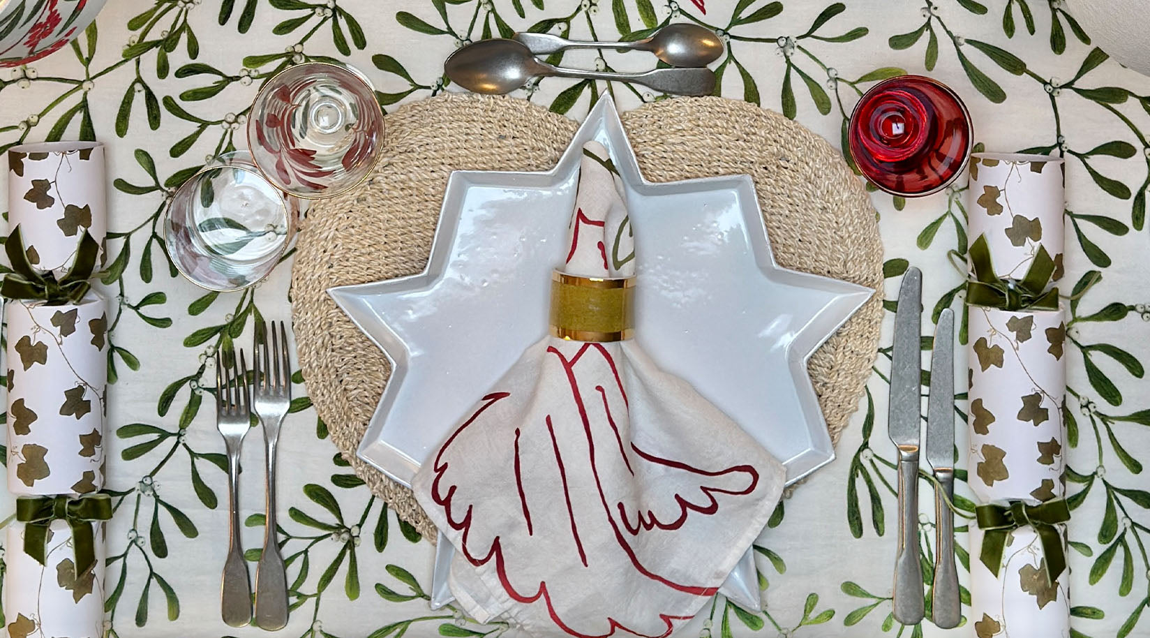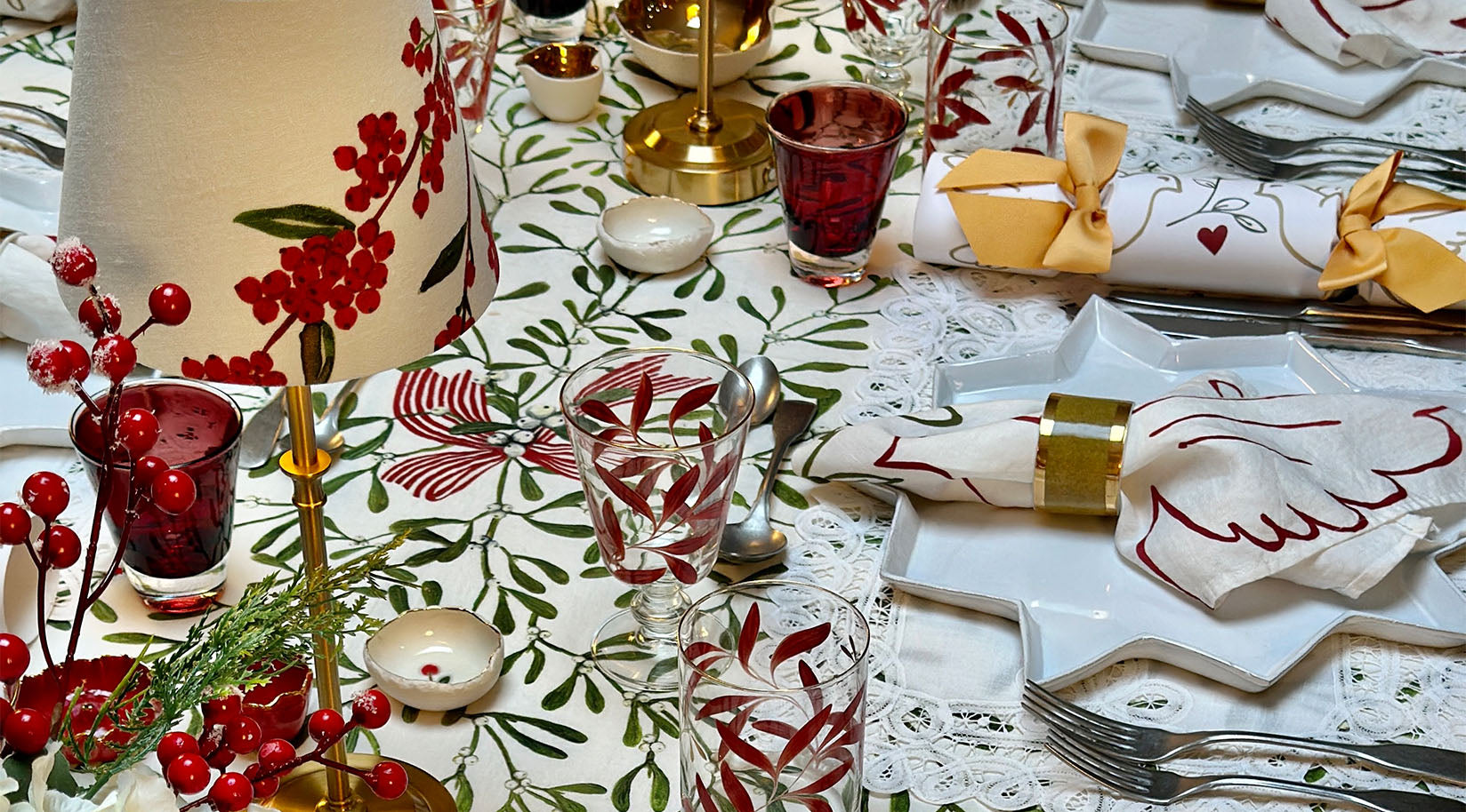 Once upon a time, on an S&B table set for Christmas, there prospered a plant called mistletoe. Garlands of evergreen branches and white berries are brought together by a festive red bow at the heart of the design.