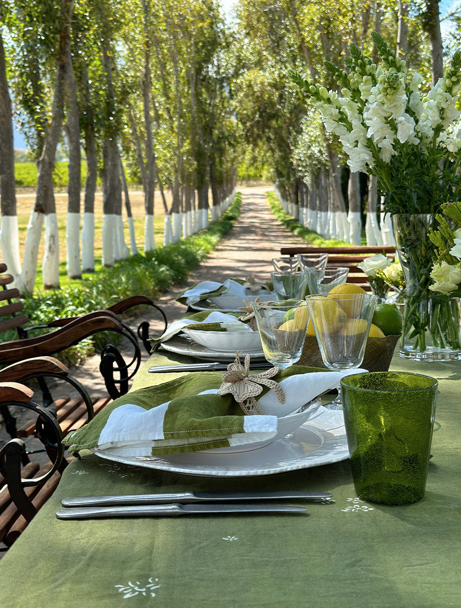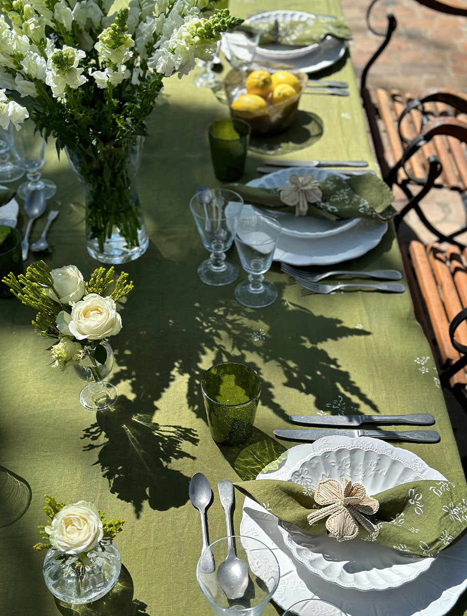 A gentle cascade of flowers adorn the edges of each tablecloth - be sure to spot the occasional bee flying amidst them! “Falling Flower” was originally designed to commemorate our co-founder Bernadette Bishop, who would hand draw the motif on all her correspondence. Now comes S&Bee, updated in a fresh new tone - a little twist on our most classic design.