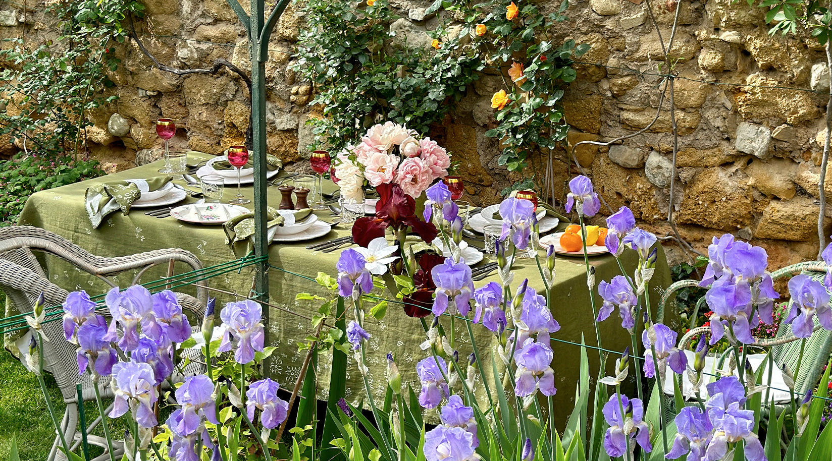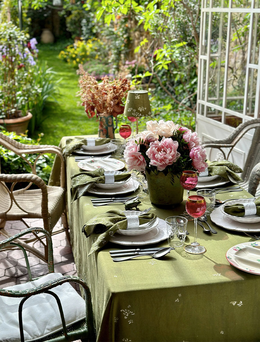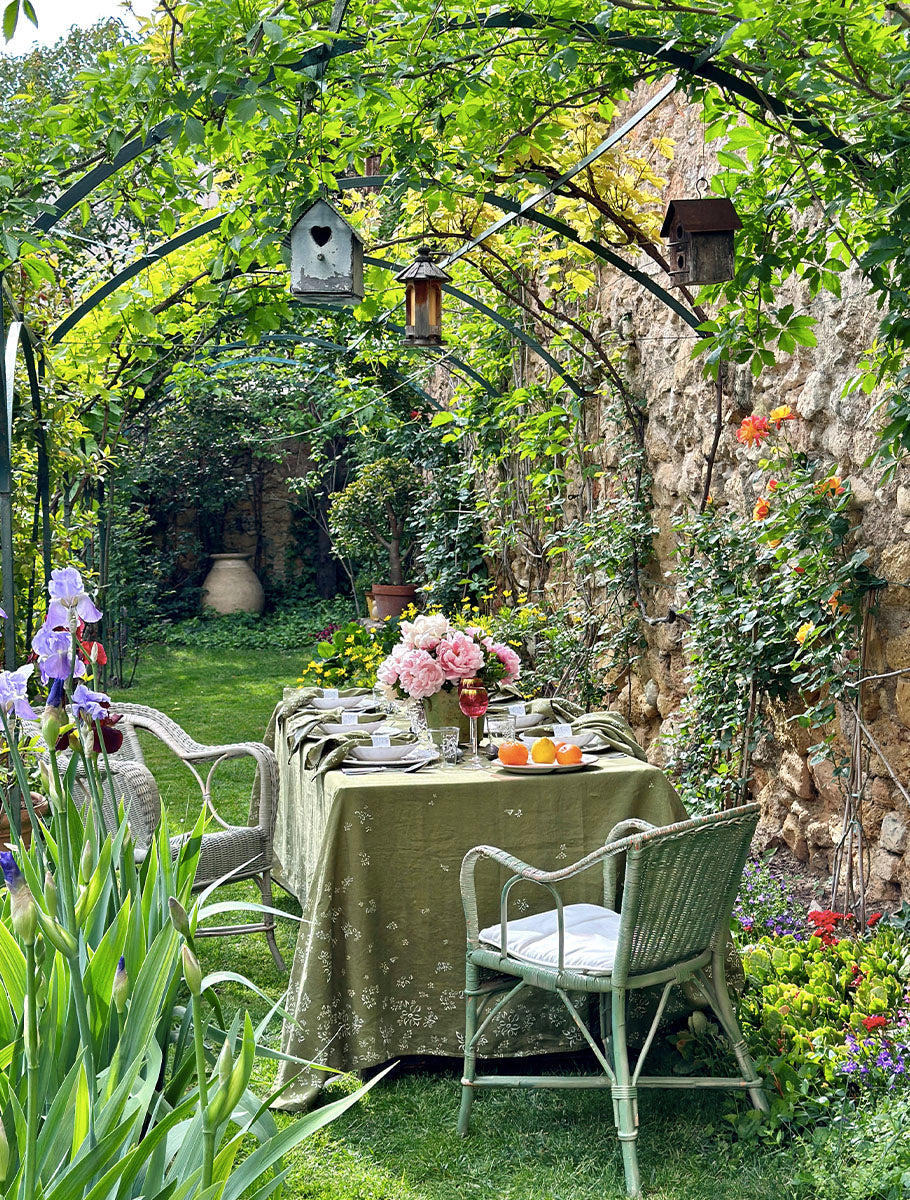Commemorating our co-founder Bernadette Bishop, this design - set in Aix-en-Provence - features a gentle cascade of flowers adorning the edges of each tablecloth. Look closely and you might spot the occasional bee flying amidst them!
