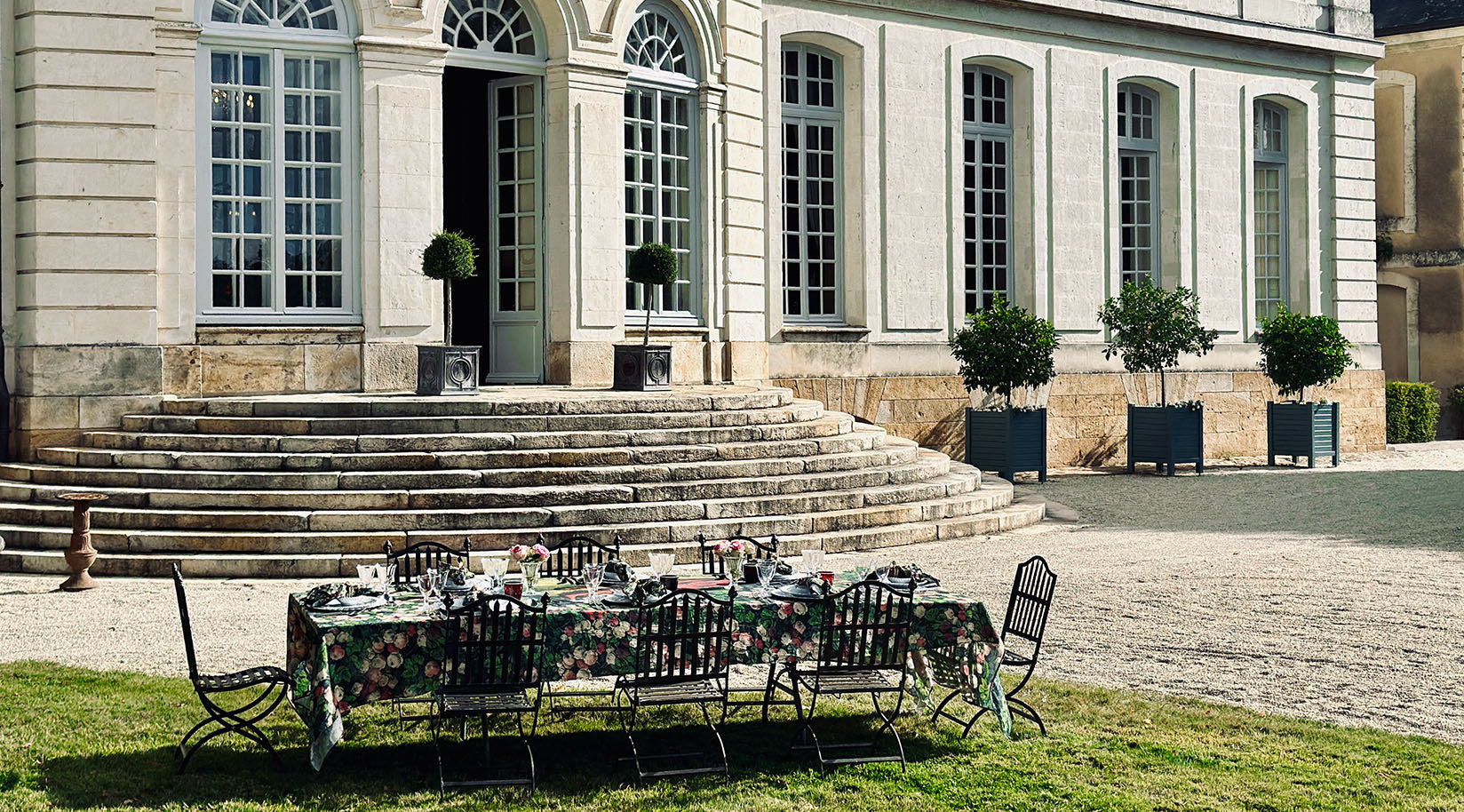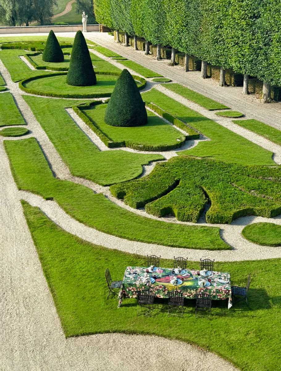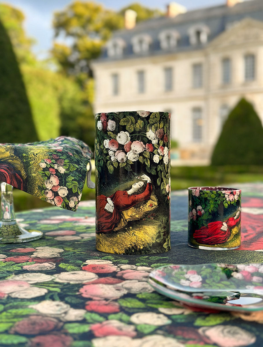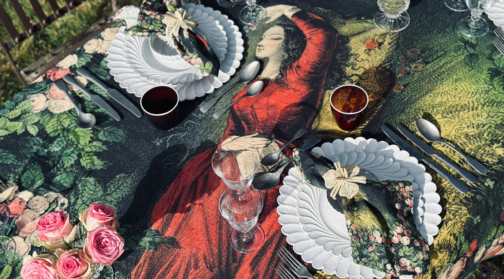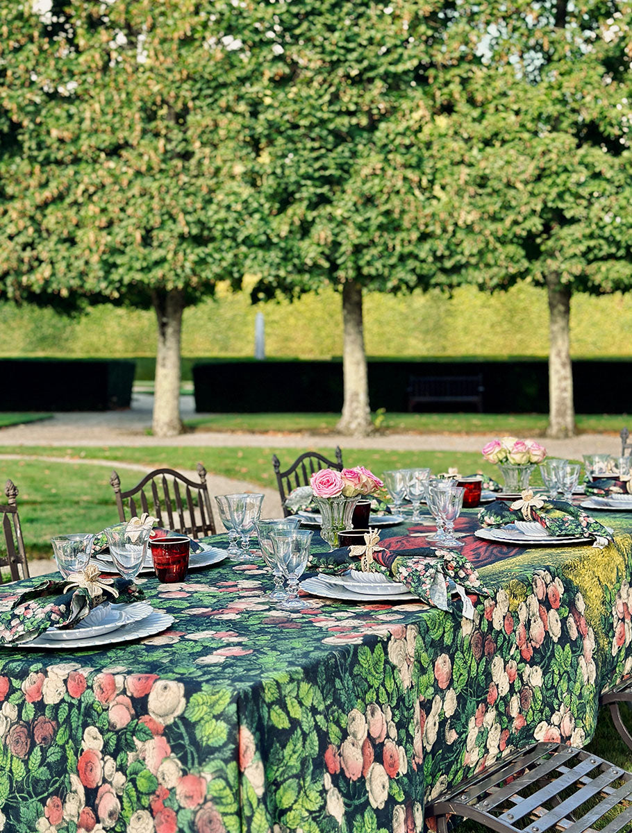 The Sleeping Beauty tablecloth, from the continuing collaboration between Summerill & Bishop and John Derian, unfurls beneath open skies, its blooms stirring softly in the breeze. A linen tableau that turns an ordinary lunch into something quietly spellbound — where every glass catches the light, and every petal seems to sigh awake.