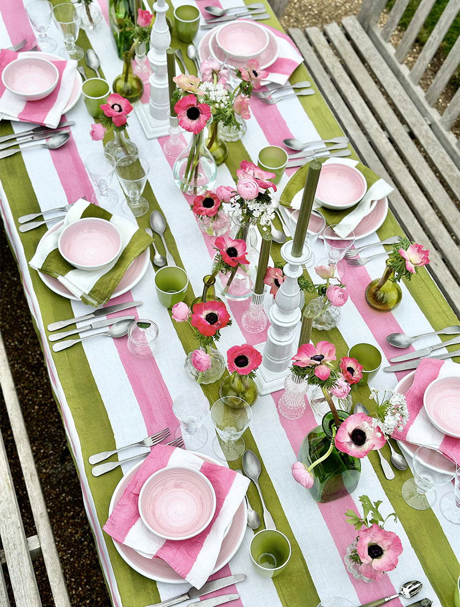 Stripe Linen Tablecloth in Rose Pink & Avocado Green is the newest addition to our dual stripes collection, also available in Avocado Green & Lemon Yellow and Sky Blue & Orange. Mix and match with complimenting green or pink stripe napkins.