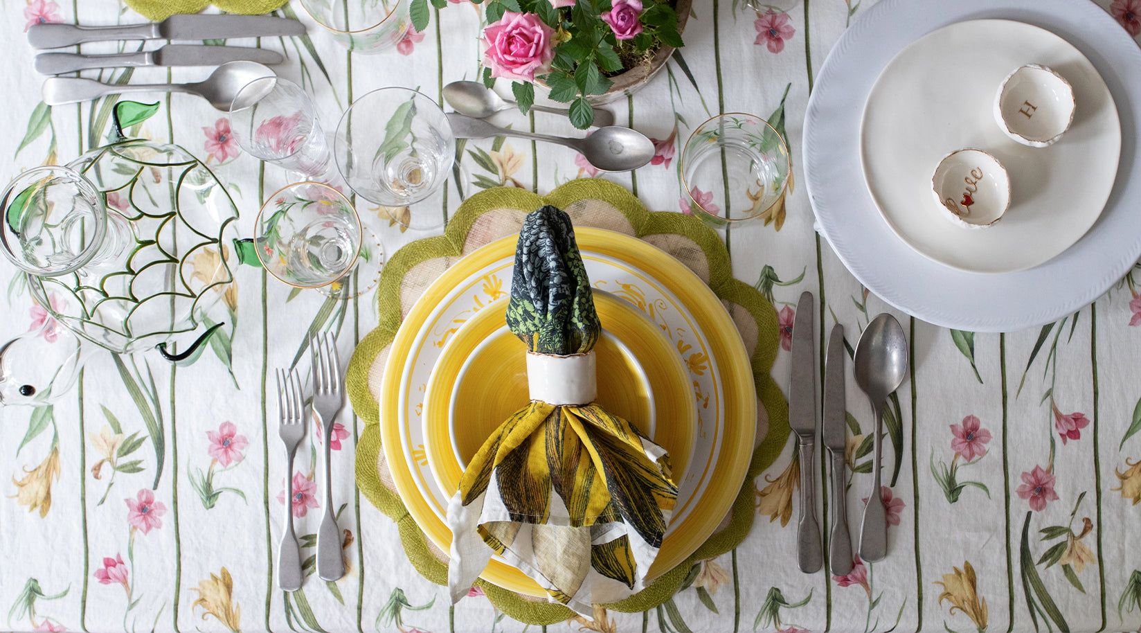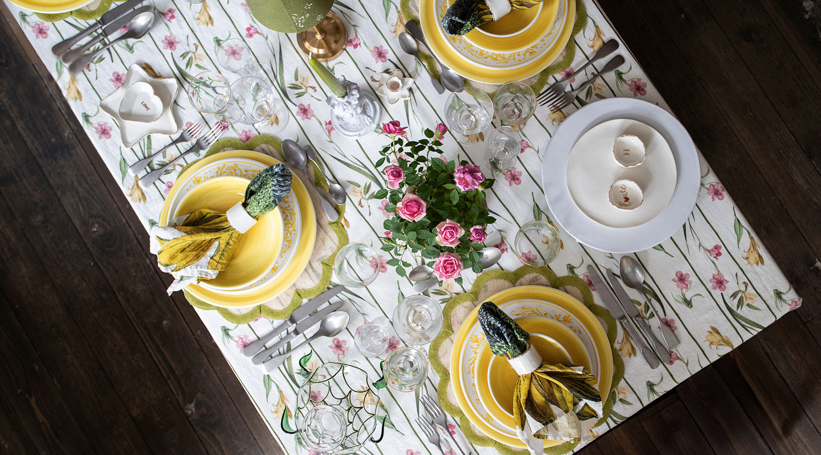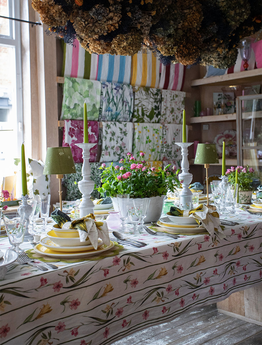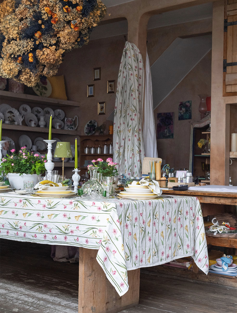 A midsummer table dressed in dancing stems of gladioli - a linen that feels freshly picked from an English cutting garden. To mirror the print’s painterly palette, we’ve paired soft yellow plates, tumbling glassware, and bright green taper candles for a layered, sun-dappled effect. A joyful ode to florals, made even more enchanting beneath a cloud of dried blooms.