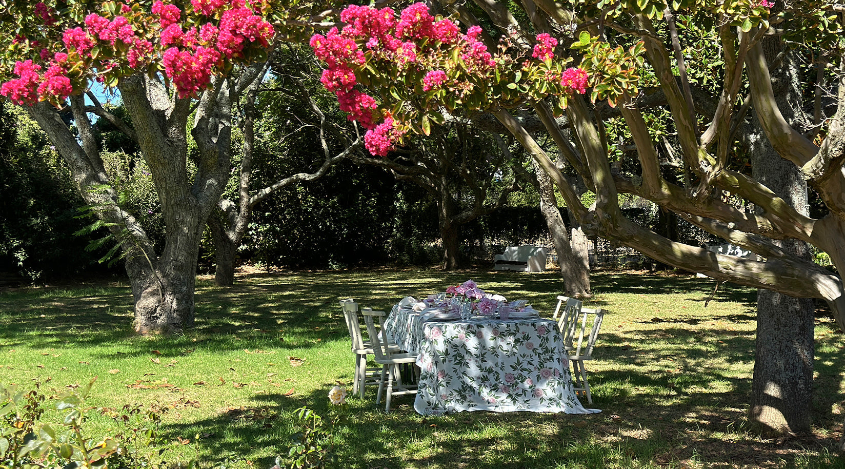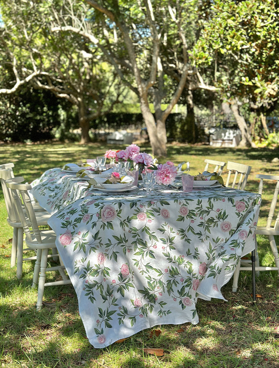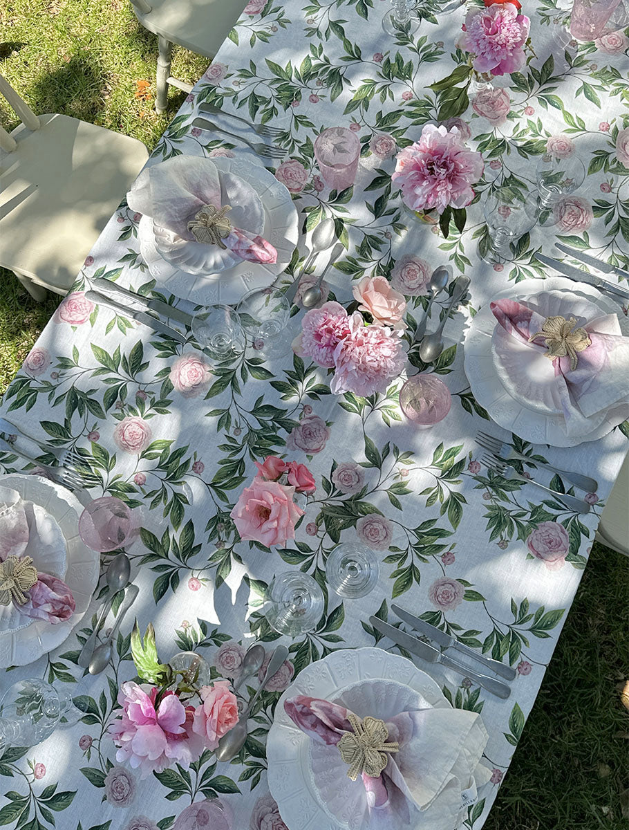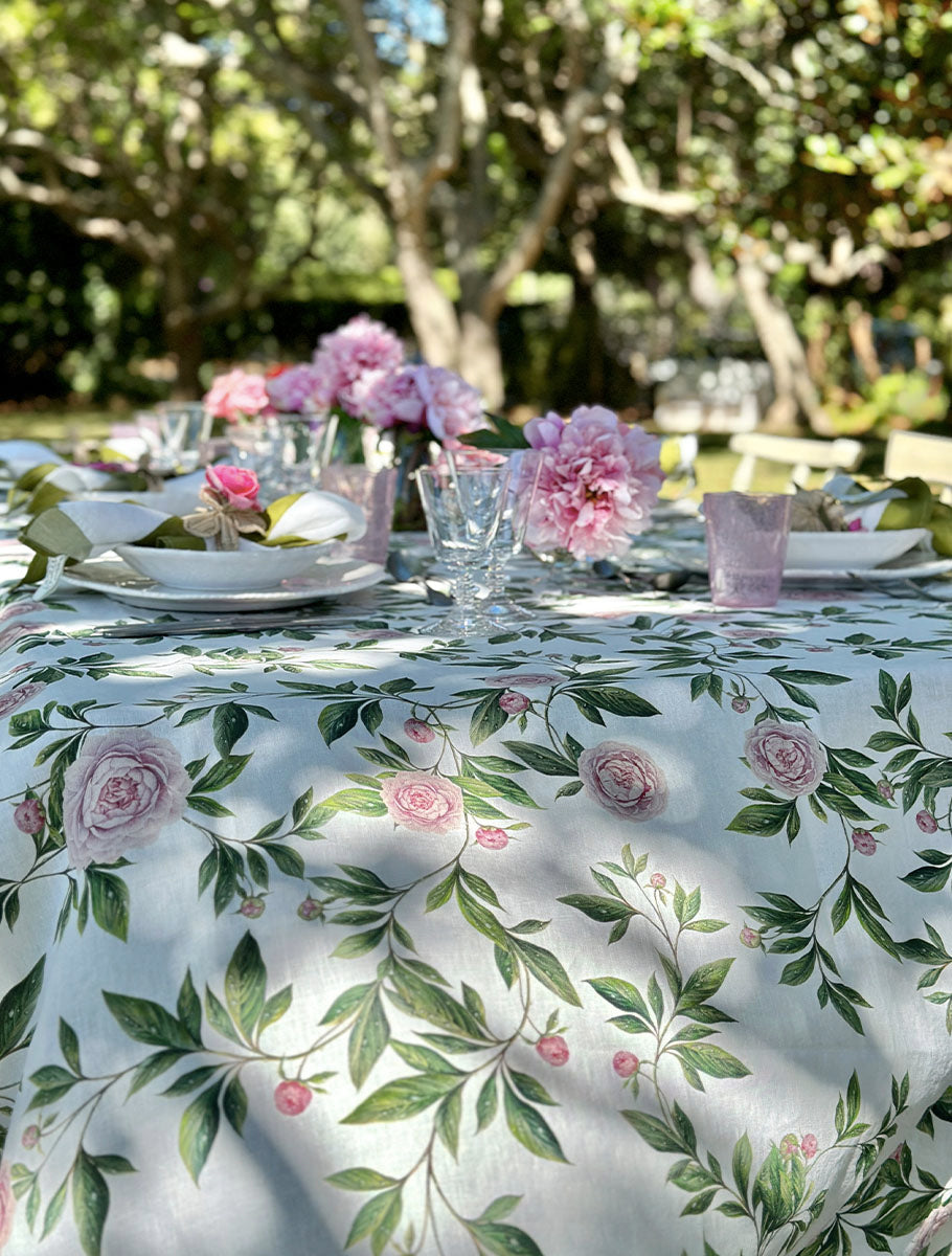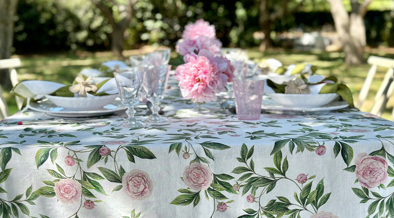 An ode to nature's timeless beauty, the 'Trailing Peony' Linen Tablecloth, with its full, opulent blooms, weaves its way across this design, capturing the fluid elegance of a garden in full bloom. Each petal is rendered delicately, creating a sense of movement, as if caught in the breeze, and adding a soft, romantic charm to your table.