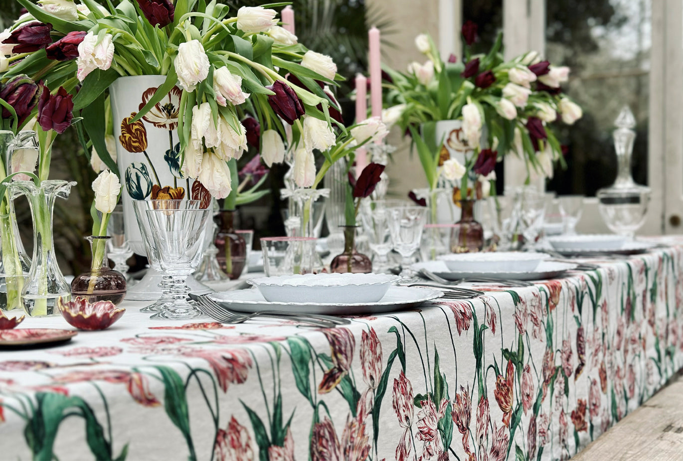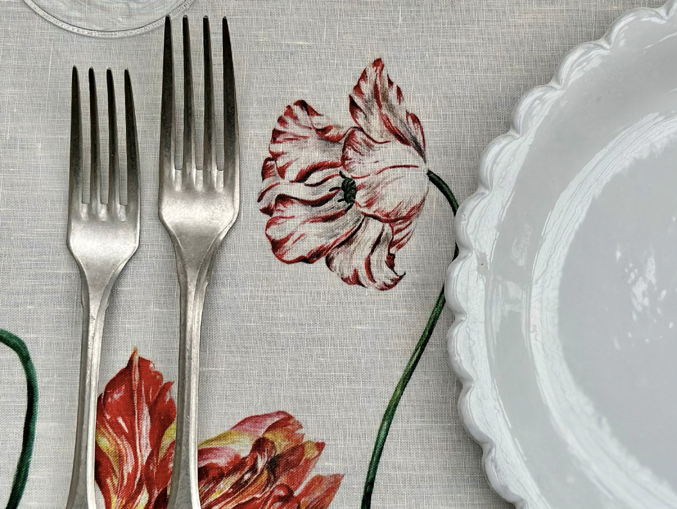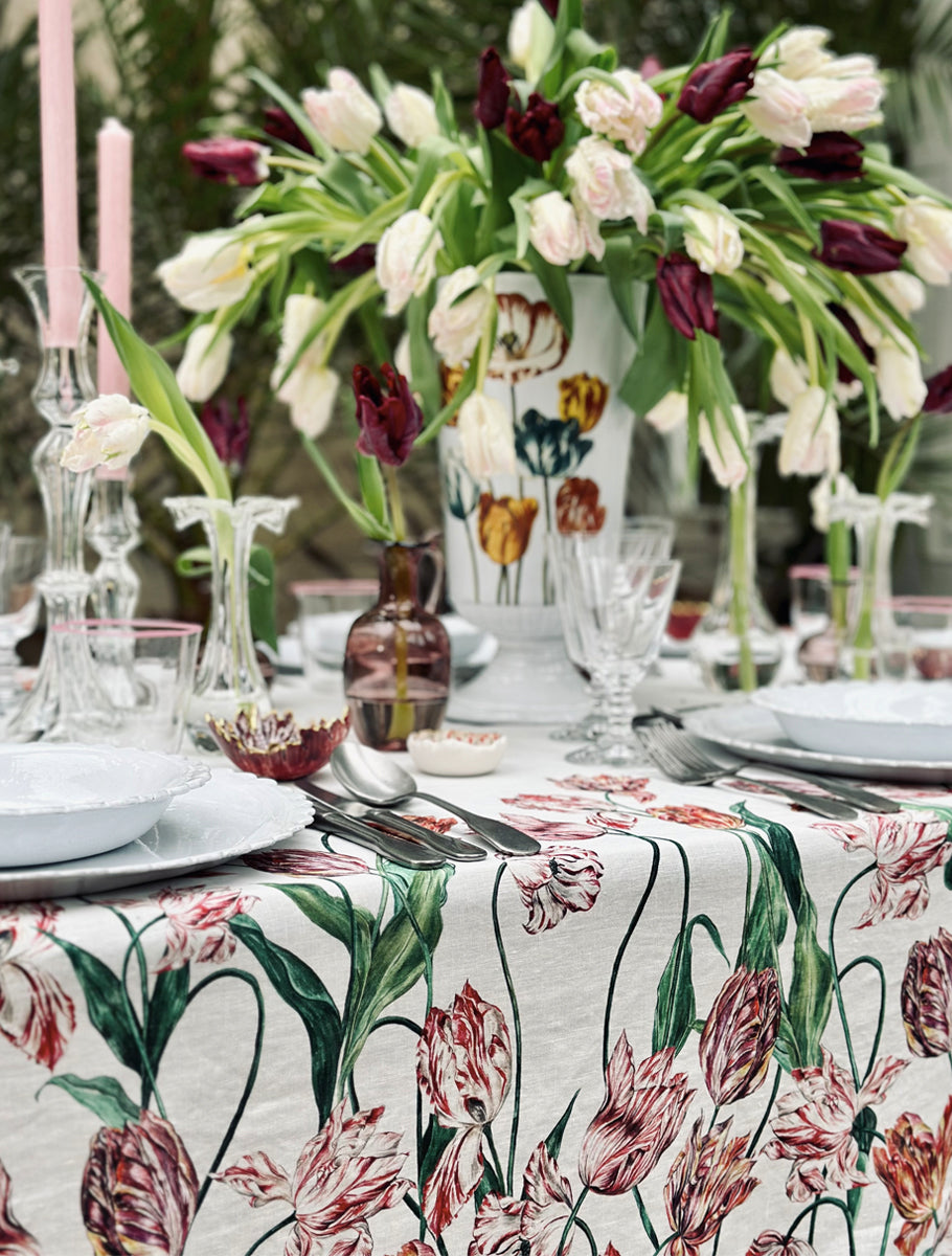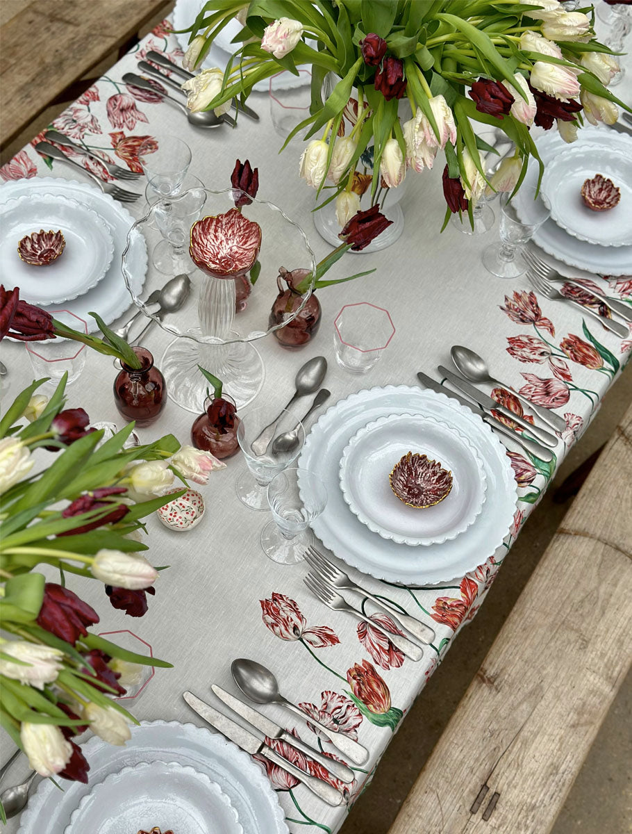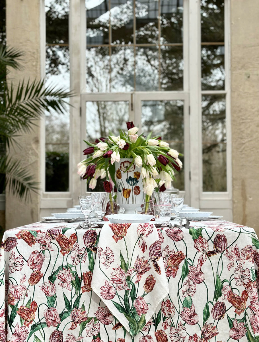 Tulipmania takes hold all over again… With rich, complex colours and elaborately curved and crimped petals that give each flower a distinctive character, this tablecloth in 100% pure French linen, explores the intriguing nature of the Tulip, a flower that has continued to beguile with its beauty, throughout the centuries.