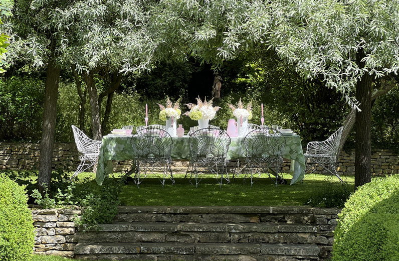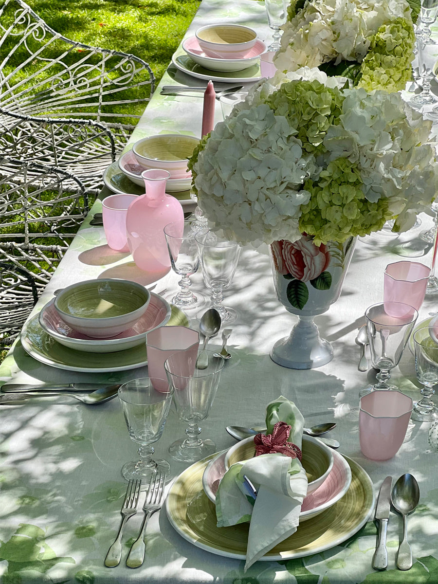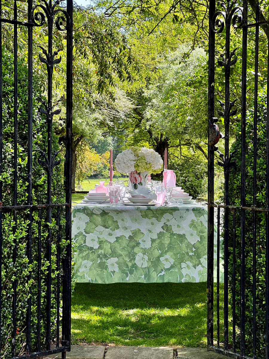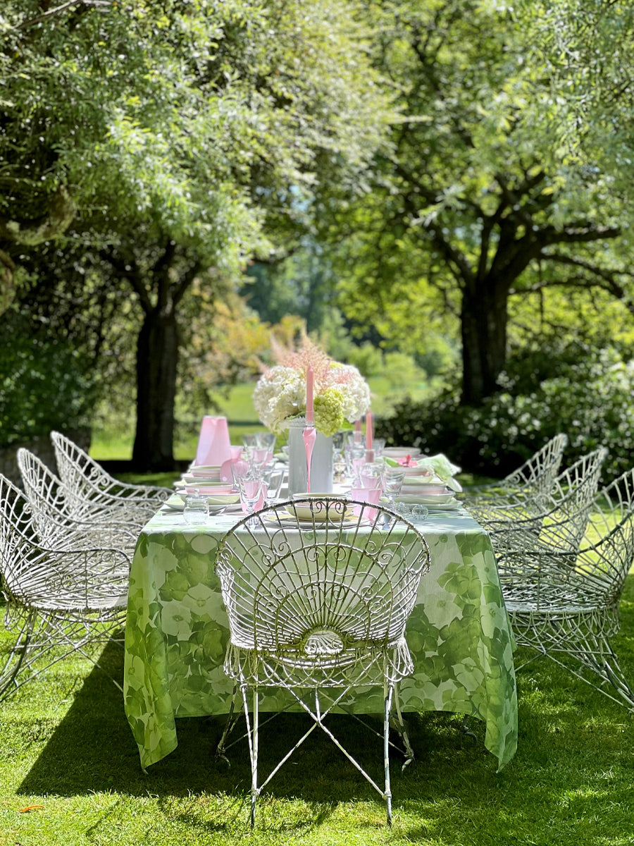 "Hydrangea" - a collection of floral inspired tablecloth and napkins. The collection is an ode to a forget-me-not summer, inspired by the blossoming and bountiful hydrangeas planted within the communal gardens of Notting Hill. Crisp white forms an elegant backdrop to exuberant inflorescence's in warm, sultry shades of green, printed onto a 100% pure linen. This tablecloth is the ultimate floral statement, for the happiest of tables, perfect for providing that distinctive feel of summer joy.