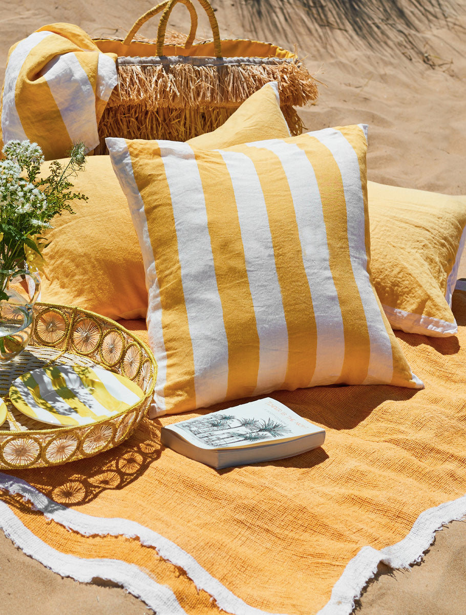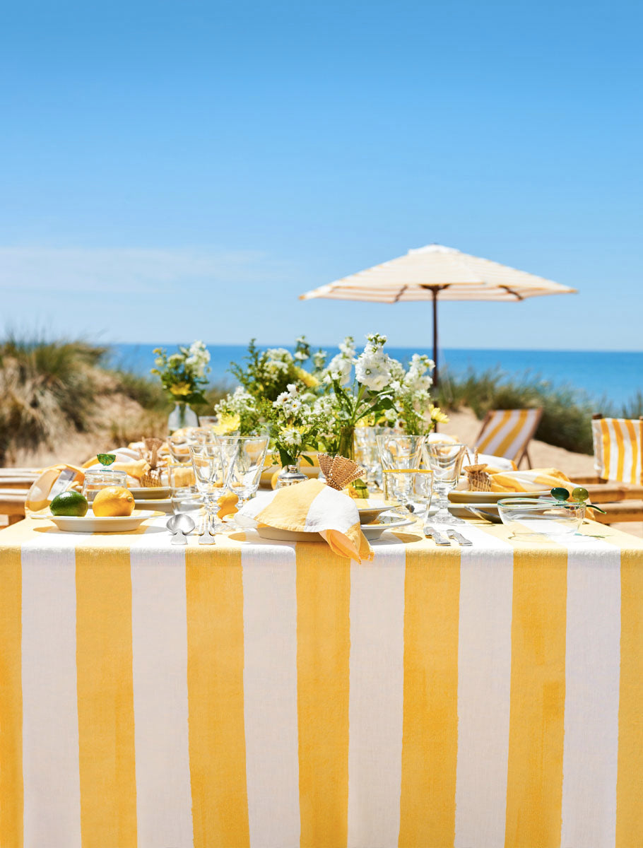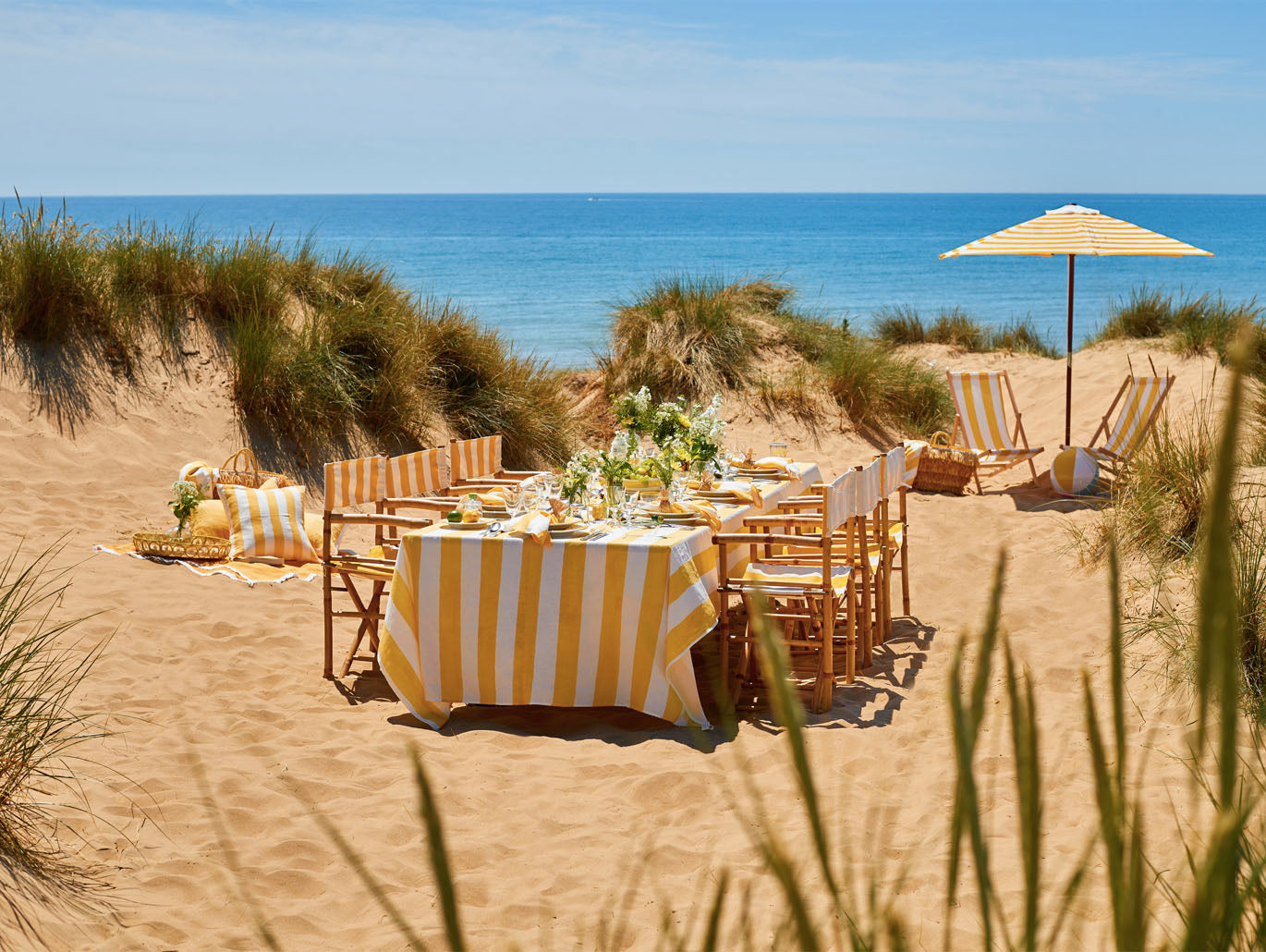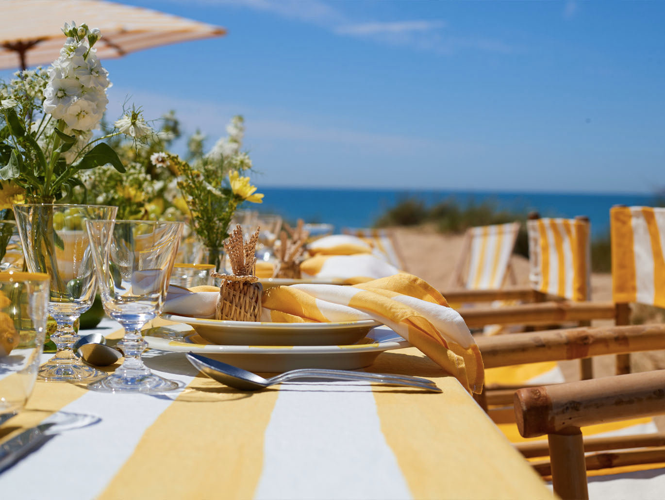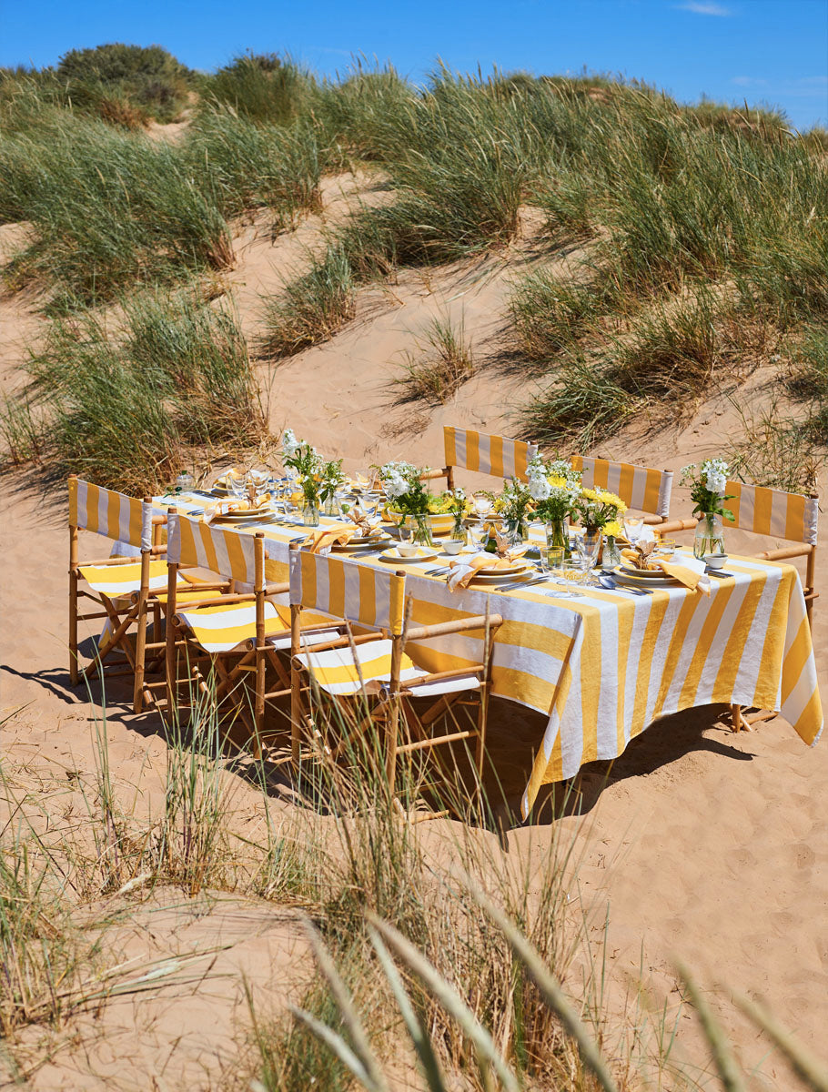 A world away from reality, high up in the dunes, an oasis awaits your arrival. The perfect mealtime milieu, made happy the S&B way with our sunshine yellow stripes. We can't think of a more beautiful lunch spot, can you?