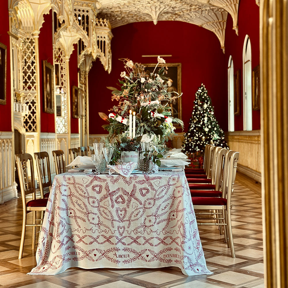 The message of ‘Amour & Bonheur’—love and happiness—playfully stretches across the table, ensuring that no matter where you’re seated, you can bask in its warm glow. Hidden treasures lie within the ornate patterns: sweet hearts symbolize ‘love,’ while those very hearts unite to form clovers, embodying luck and echoing the joy of happiness. Olive branches and leafy vines weave together in endless chains, signifying everlasting love, while playful bows represent bonds and the delightful notion of coming together.