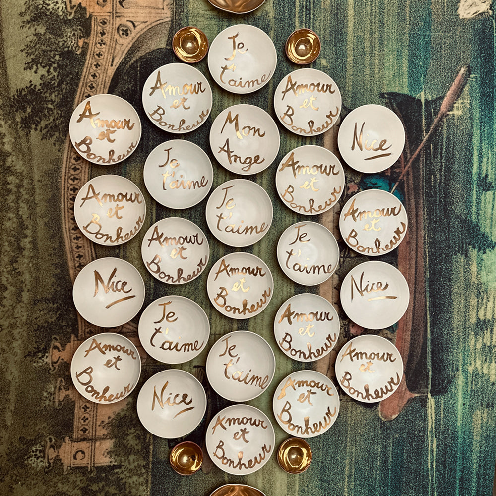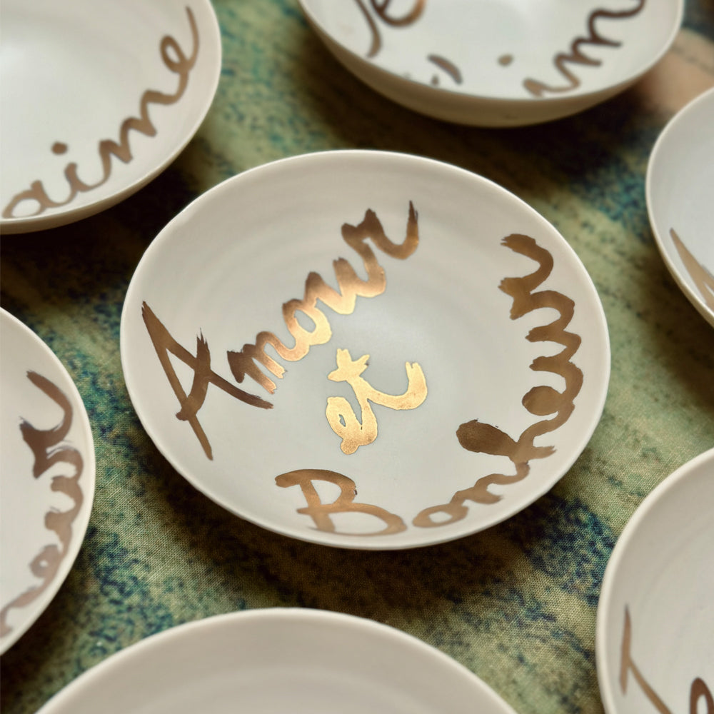 Created using a matte porcelain, the joyful French phrase “Amour et Bonheur” has been painted inside in a gold glaze making a special keepsake to give or keep forever.