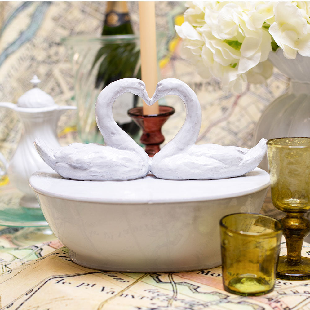 ... Read moreElegant and timeless, the Cygne Box by Astier de Villatte is a handcrafted ceramic piece designed to hold small treasures. Made in Paris from black terracotta and finished with a luminous white glaze, its swan form reflects the brand’s dedication to traditional craftsmanship. Each piece is individually created by Tibetan artisans and engraved with their initials, a subtle mark of authenticity. Gently irregular in shape, this decorative ceramic box brings refinement, artistry and character to the home.