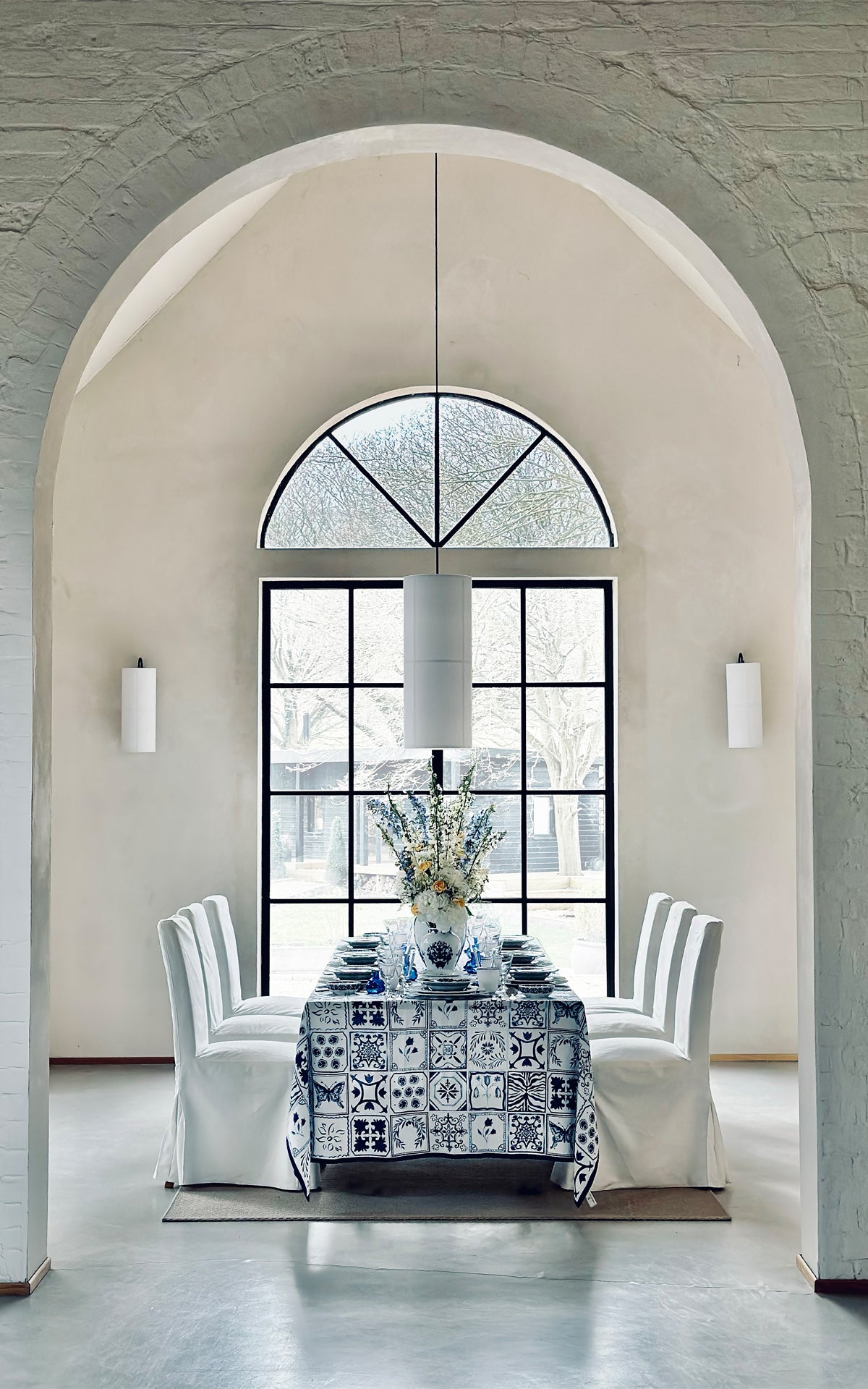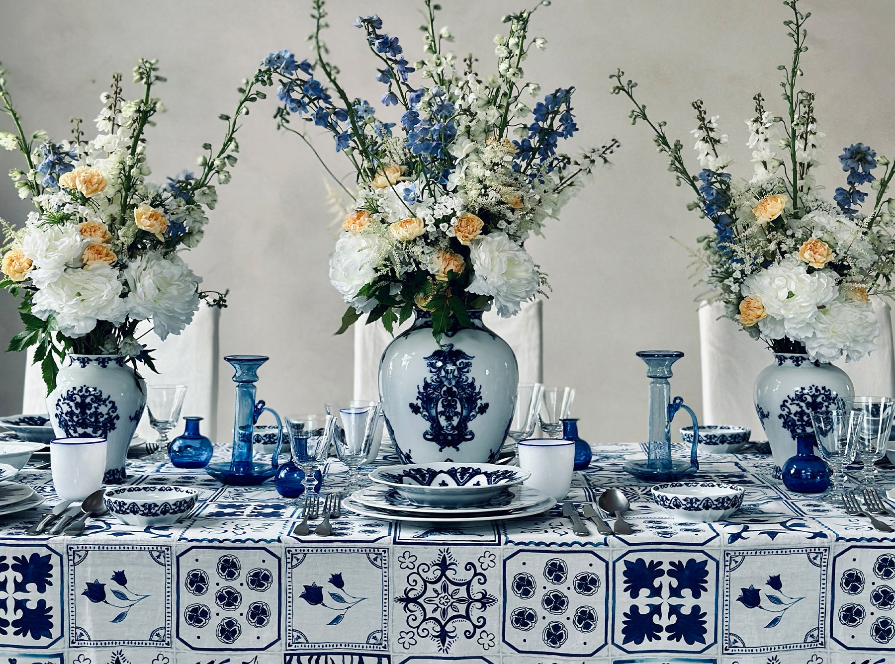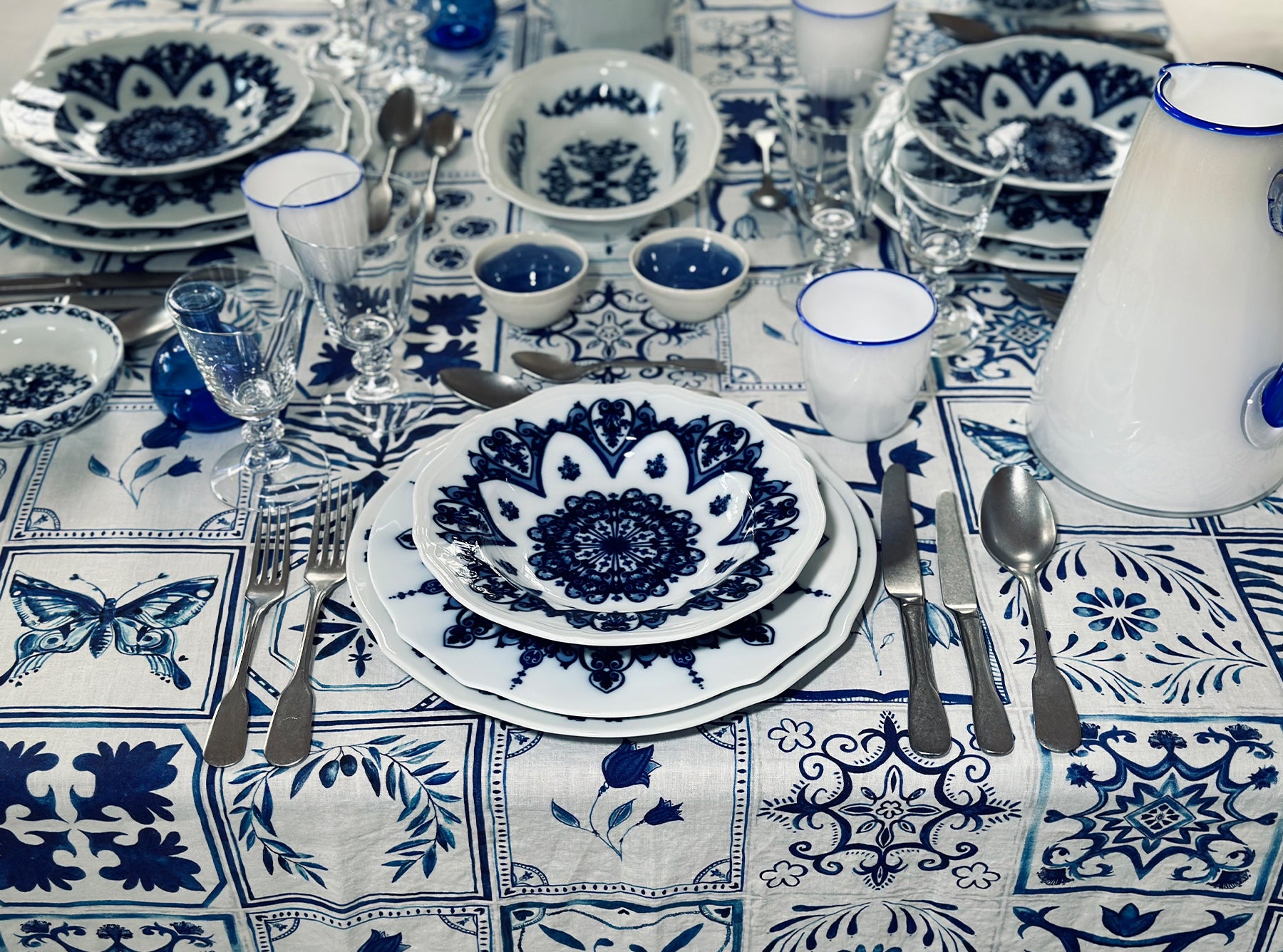 A unique linen tablecloth design that merges the beguiling beauty of traditional Portuguese Azulejos tiles with signature Summerill & Bishop artistry.