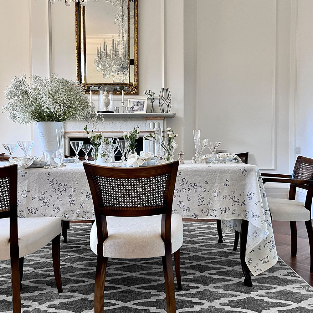 Designed by S&B in memory of our co-founder Bernadette Bishop, these white linen napkins feature her signature hand drawn midnight blue flower as a subtle pattern and match our tablecloth design by the same name. The napkins look great on any surface, though, adding an elegant pop of colour and style to your table.